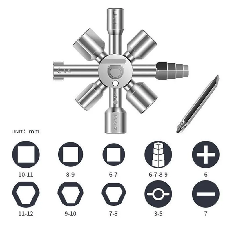 Be the first to review “ 10 In 1 Multifunction Cross Switch Square Key Wrench Alloy Universal Triangle Elevator Electrical Cupboard Box Hand Tool” Cancel reply