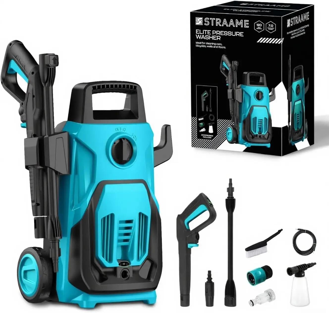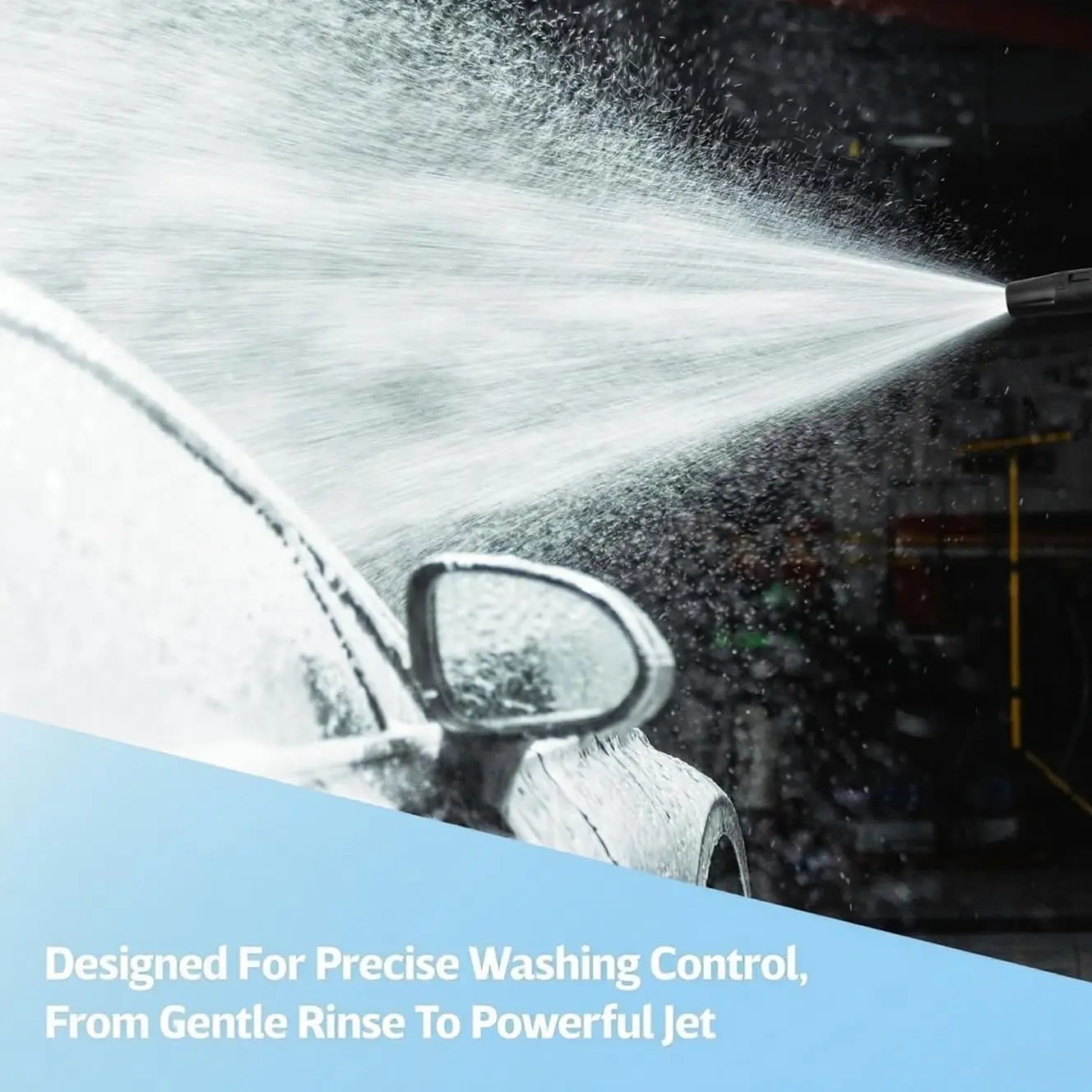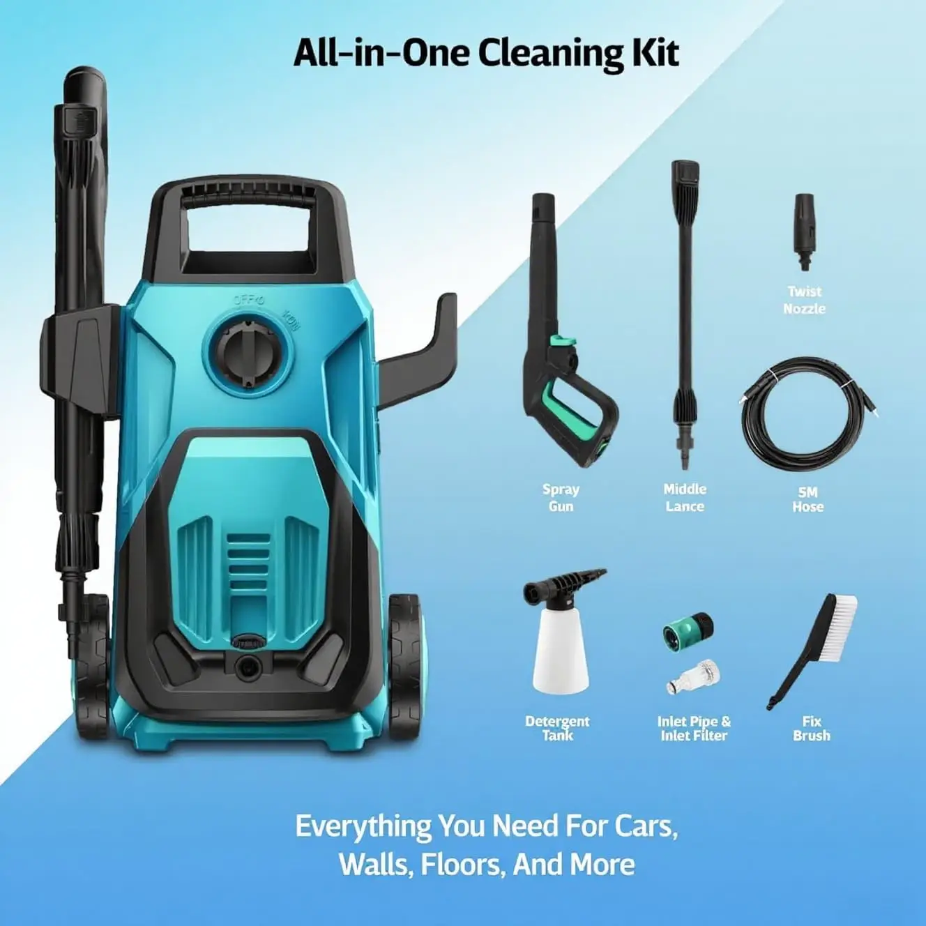 Easy to Store, Easy to Use, Everything Onboard: This portable pressure washer stays tidy thanks to onboard accessory storage and lance clips. Your full kit docks on the body: Spray Gun, Middle Lance, Twist Nozzle, 5 M Hose, Detergent Tank, Inlet Pipe & Inlet Filter and Fix Brush (car brush). Clip on foam for a rich car wash, switch back to the lance for decking—no lost parts, no mess, just ready to go power washers performance. The quick gun connect with safety lock lets you park or swap the lance confidently.