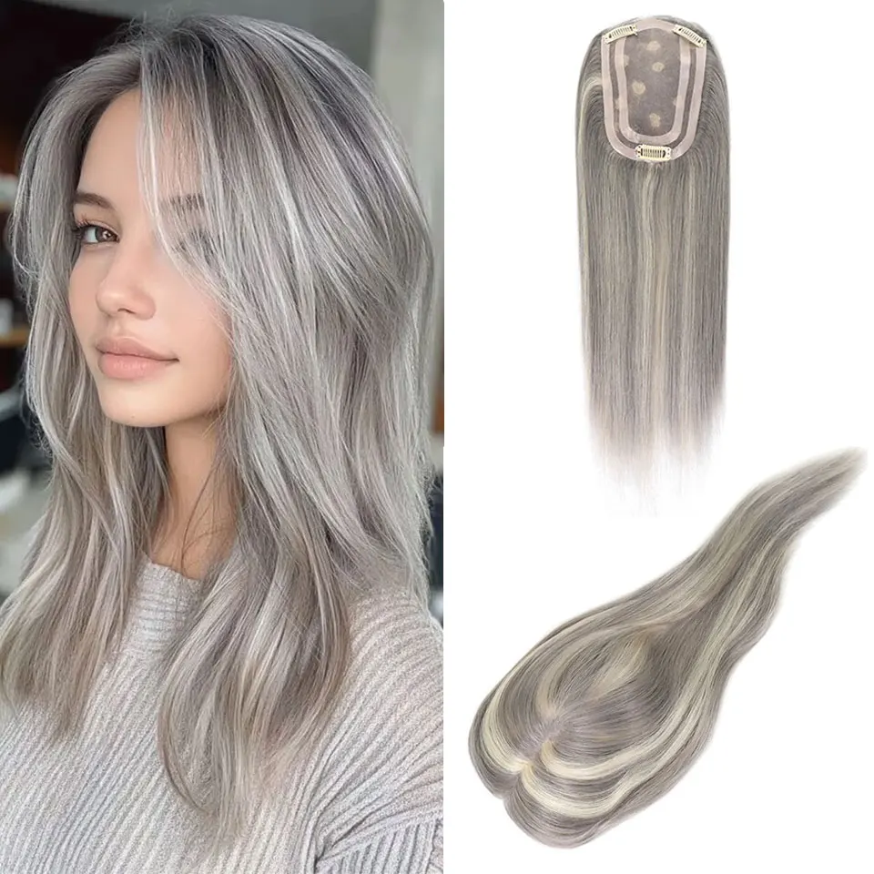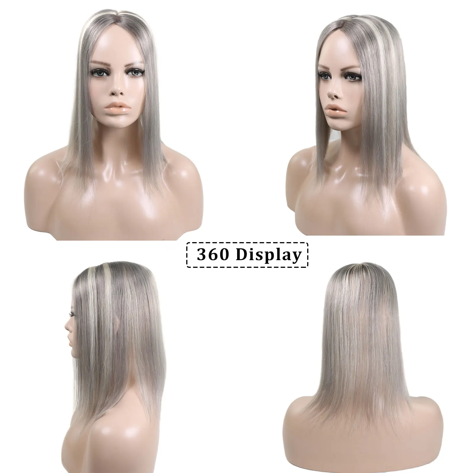 14Inch Grey Highlight Mono With PU Human Hair Toppers Hair Pieces For Women Hair Clips In Toppers Extensions For Women Toupee