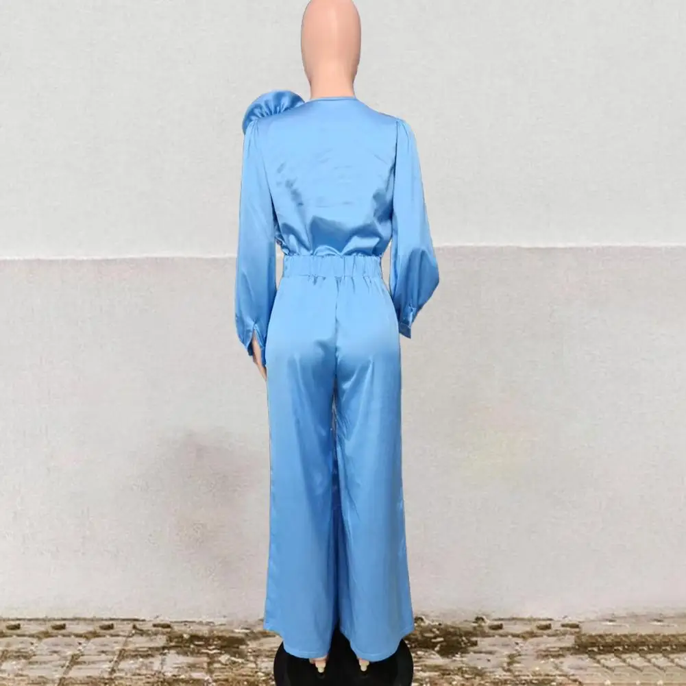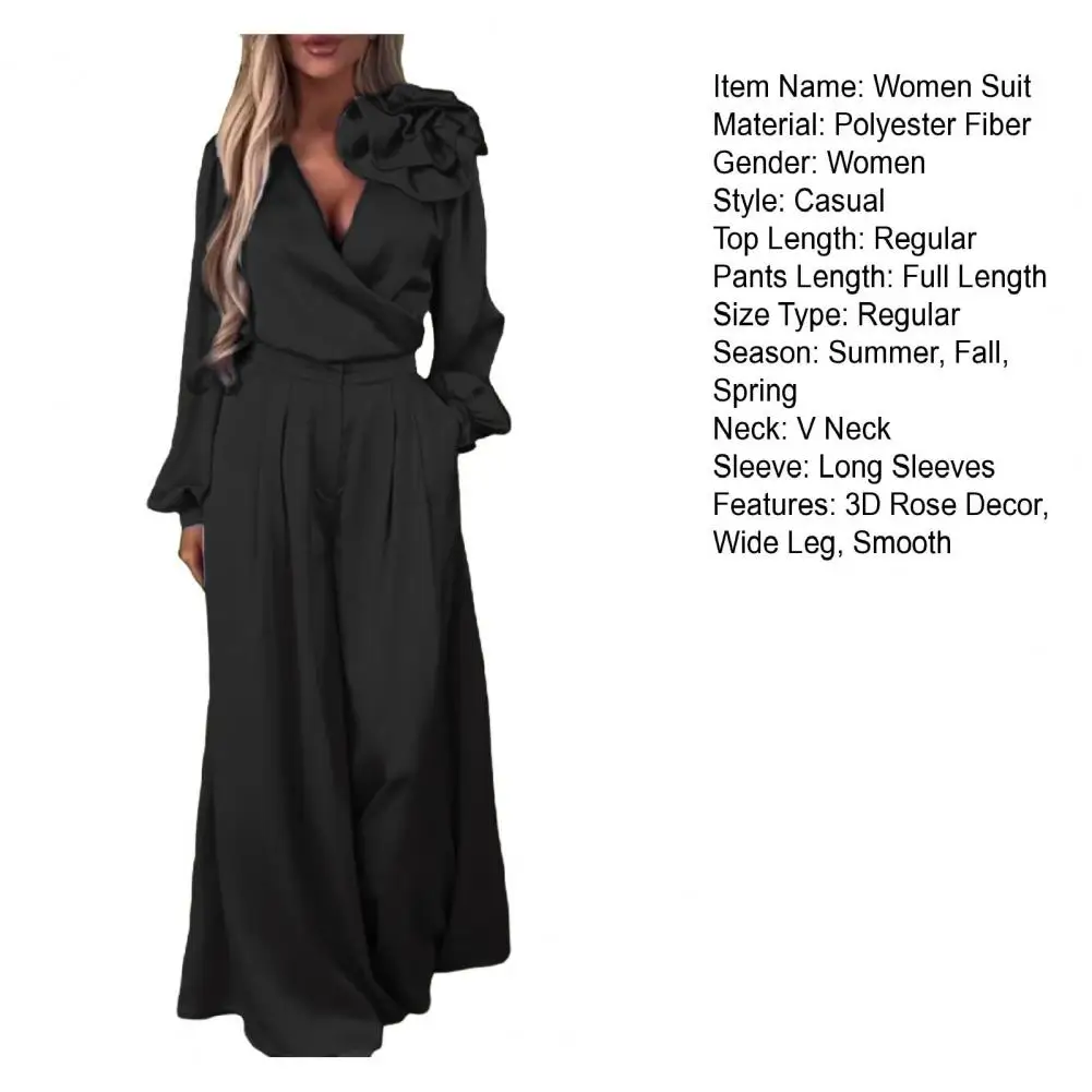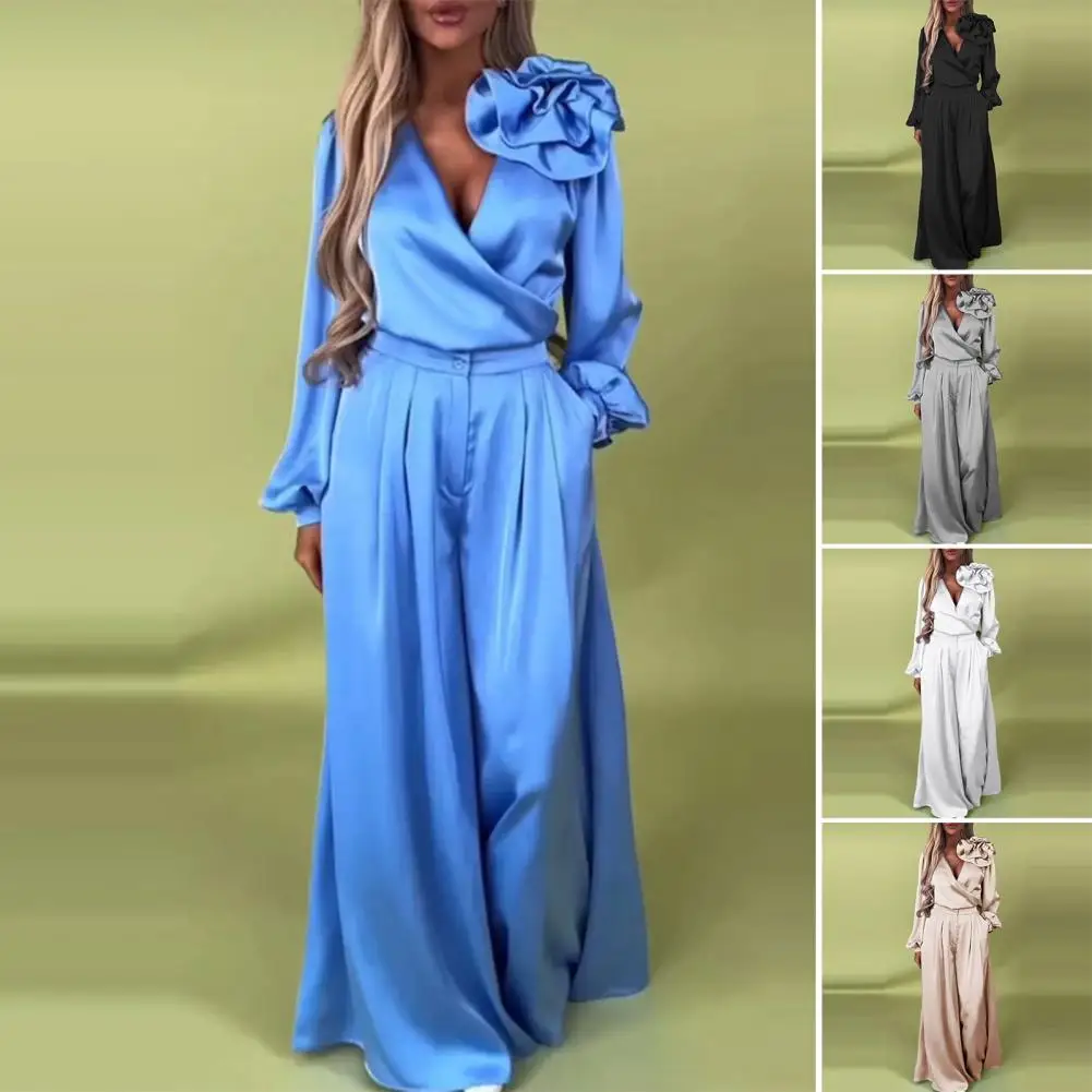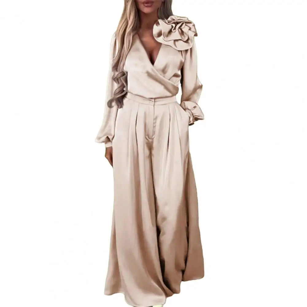 2 Pcs/Set Women Top Pants Suit 3D Flower Decor Satin V Neck Long Sleeve Blouse High Waist Wide Leg Loose Trousers with Pockets Formal Commuting Outfit