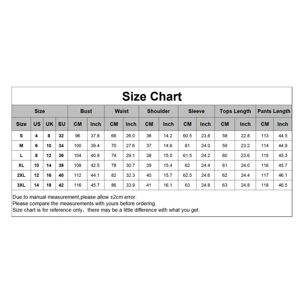 Size: 2XL, Bust: 112cm/44.1″, Top Length: 62cm/24.4″, Sleeve: 62.5cm/24.6″, Shoulder: 40cm/15.7″, Pants Length: 117cm/46.1″, Waist: 82cm/32.3″ (Approx.)