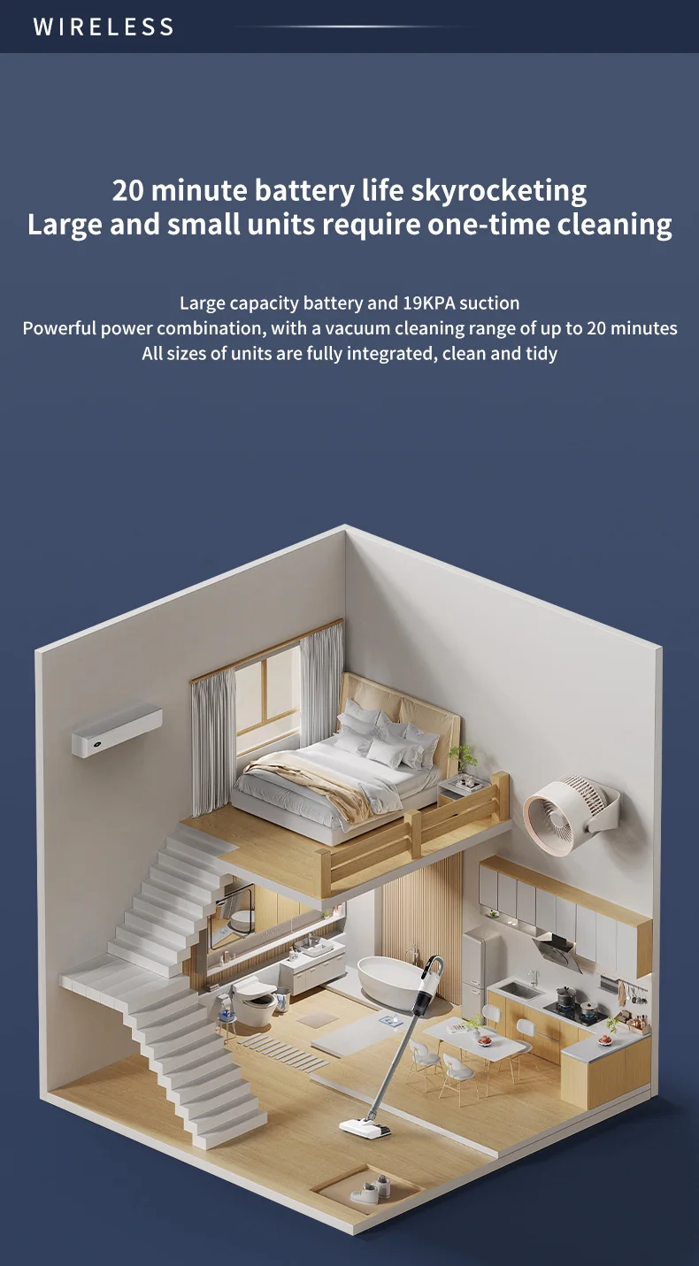 Large capacity battery and 19KPA suction Powerful power combination, with a vacuum cleaning range of up to 20 minutes All sizes of units are fully integrated, clean and tidy