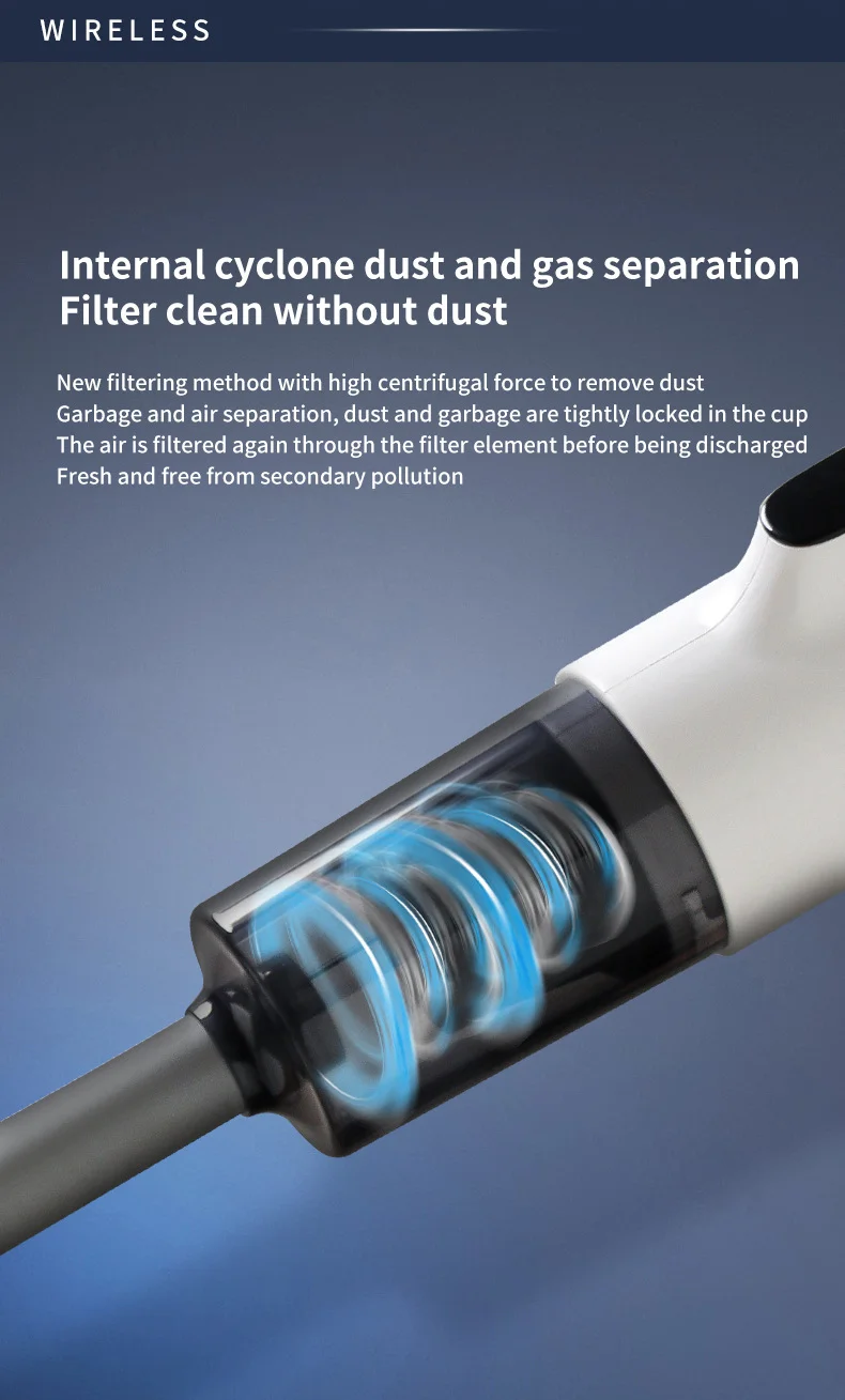 New filtering method with high centrifugal force to remove dust Garbage and air separation, dust and garbage are tightly locked in the cup The air is filtered again through the filter element before being discharged Fresh and free from secondary pollution