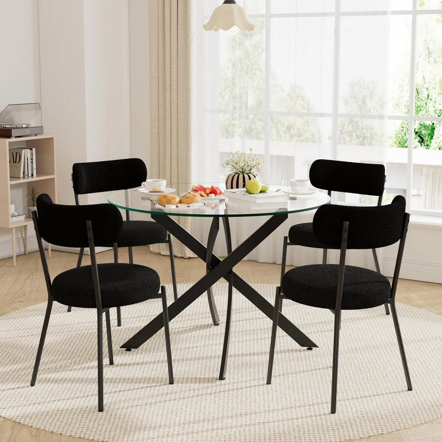 [Modren Round Table with Chairs] This circle dining table set includes one beautifully designed round table and four boucle chairs, perfect for fostering engaging discussions with family and friends in a cozy atmosphere.