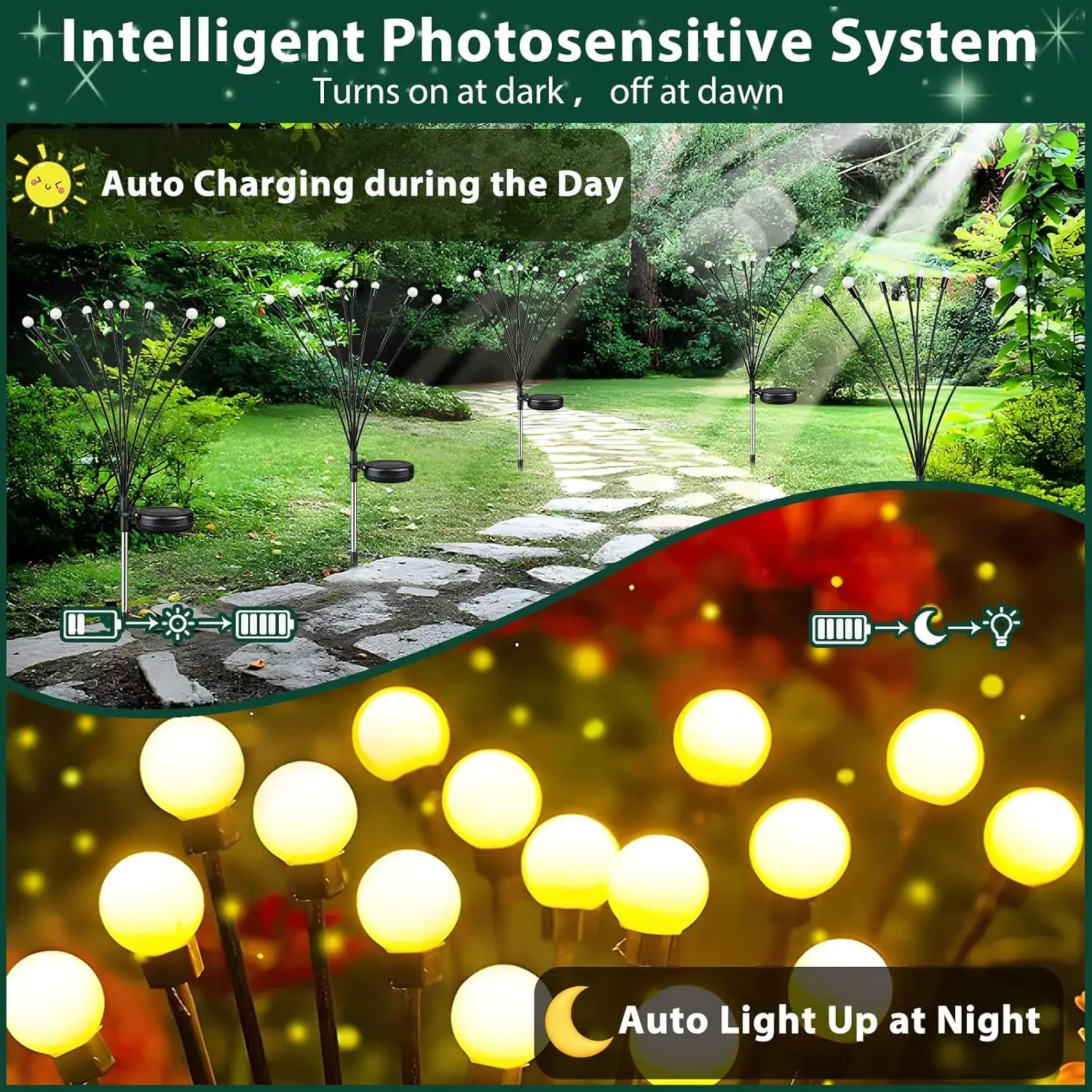 【Long Lasting & Solar Powered & Auto ON/OFF】This solar powered firefly light is equipped with a 1.2V/600mAh Ni-MH AA Battery and built-in sensor that switch on and off automatically. The outdoor lights for garden decoration can glow for 6-12 hours after being fully charged in the sun. You do not worry about the rainy or snowy days, keeping your home and garden sparkling every night.