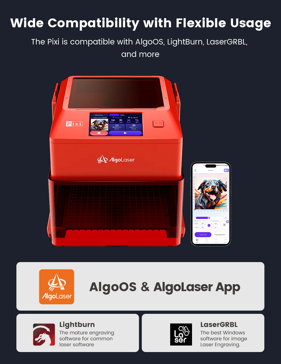 - Software: AlgoLaser APP / Lightburn / LaserGRBL/Web UI/Touch Screen,AlgoLaser APP / Lightburn / LaserGRBL/Web UI/Touch Screen