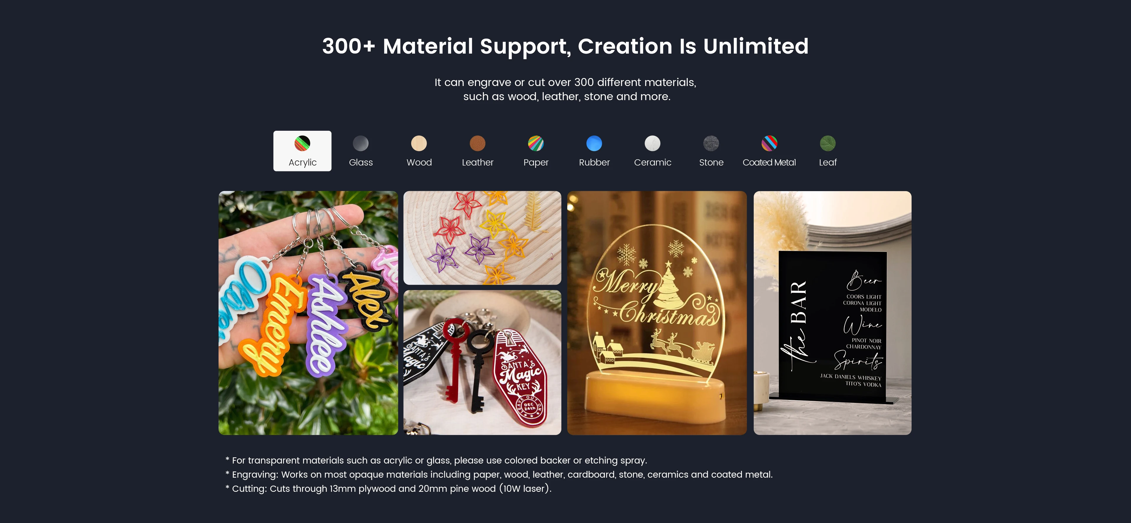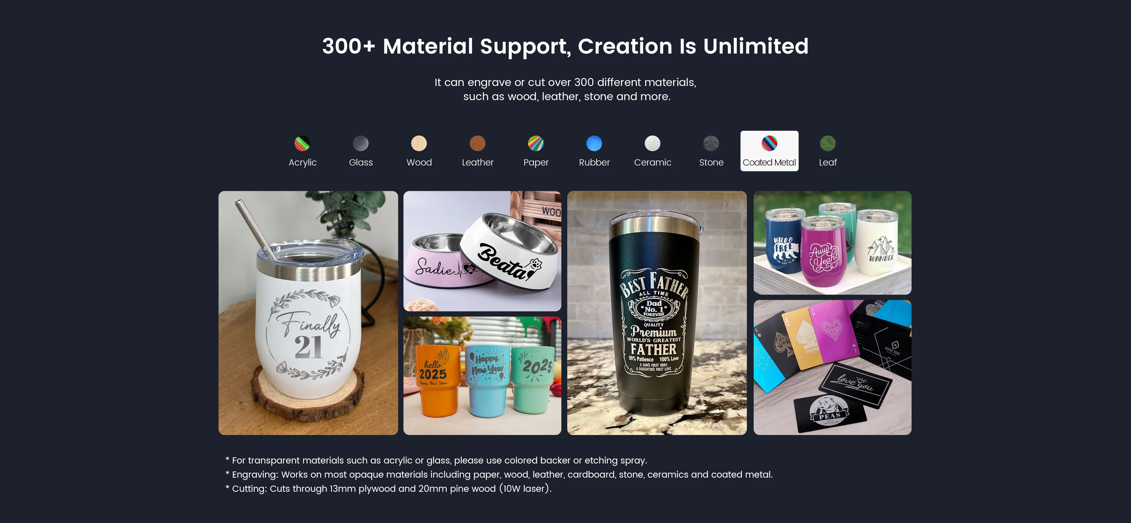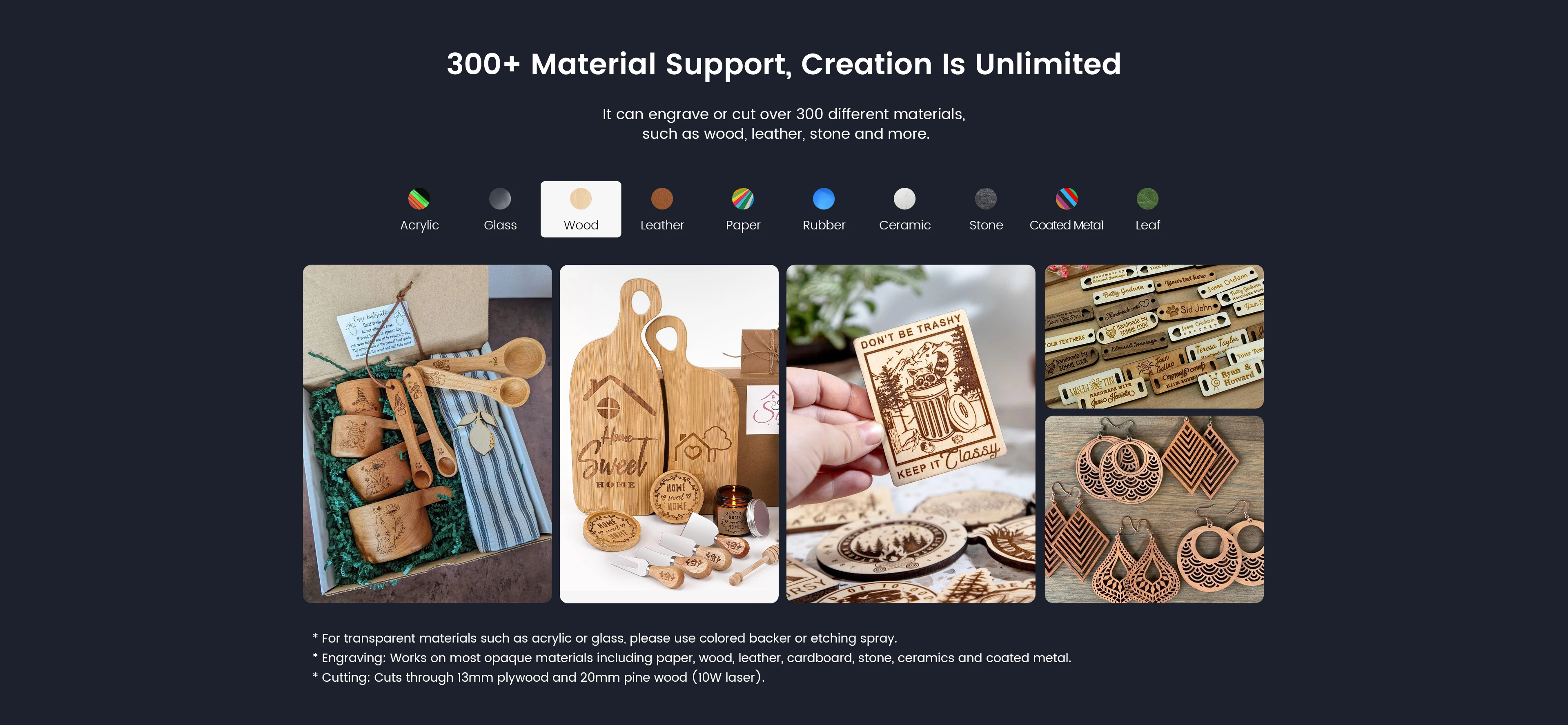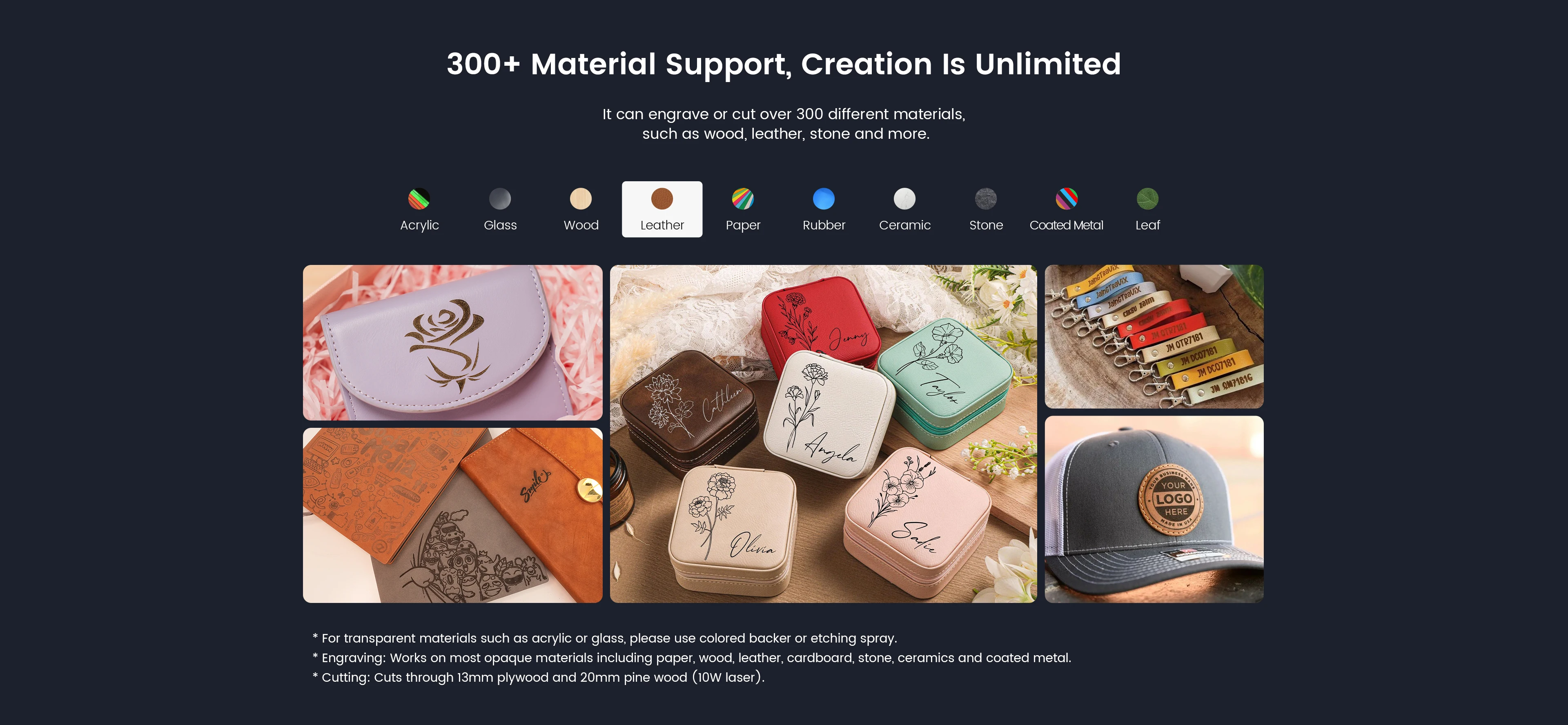 It can engrave or cut over 300 different materials, such as stainless steel, wood, leather and more. For transparent materials such as acrylic or glass, you might need to use colored backer or etching spray.