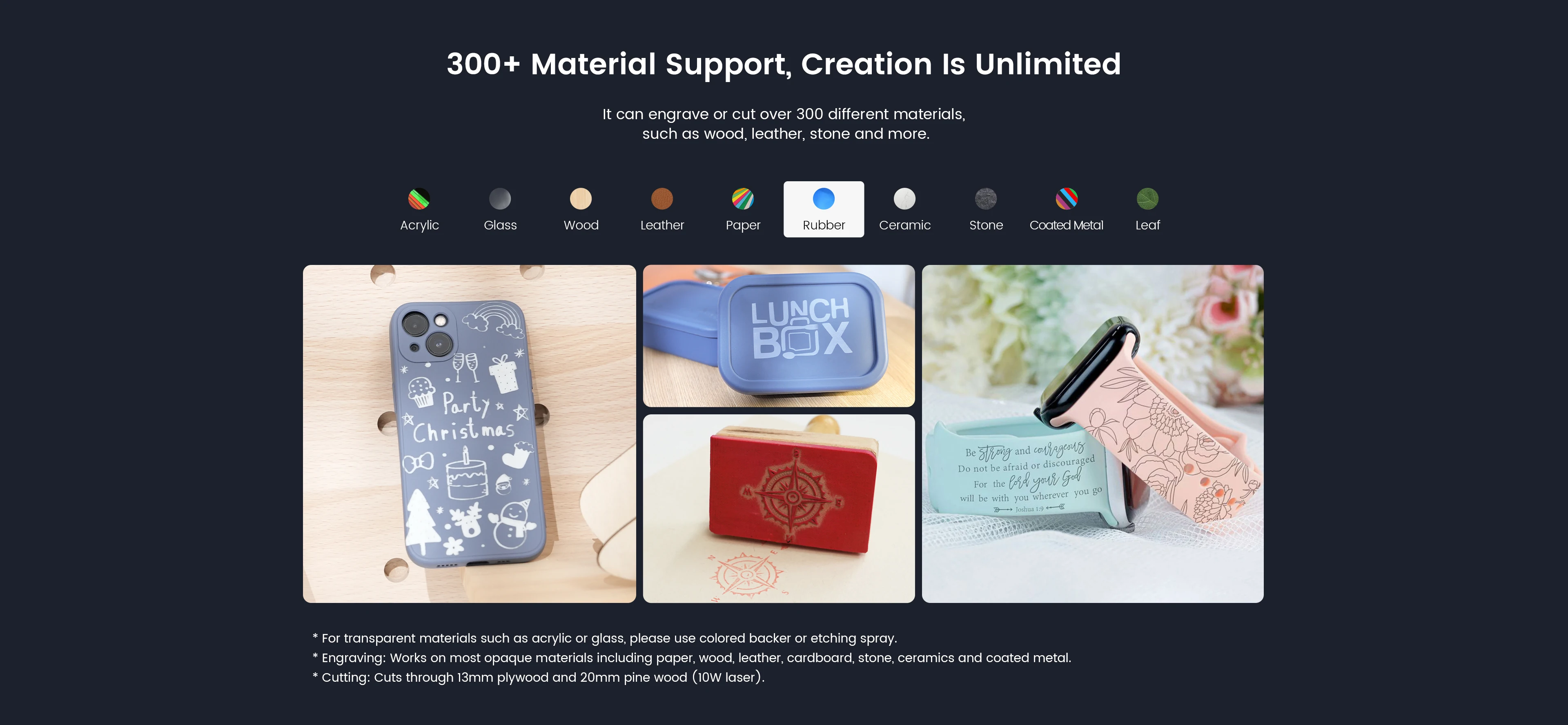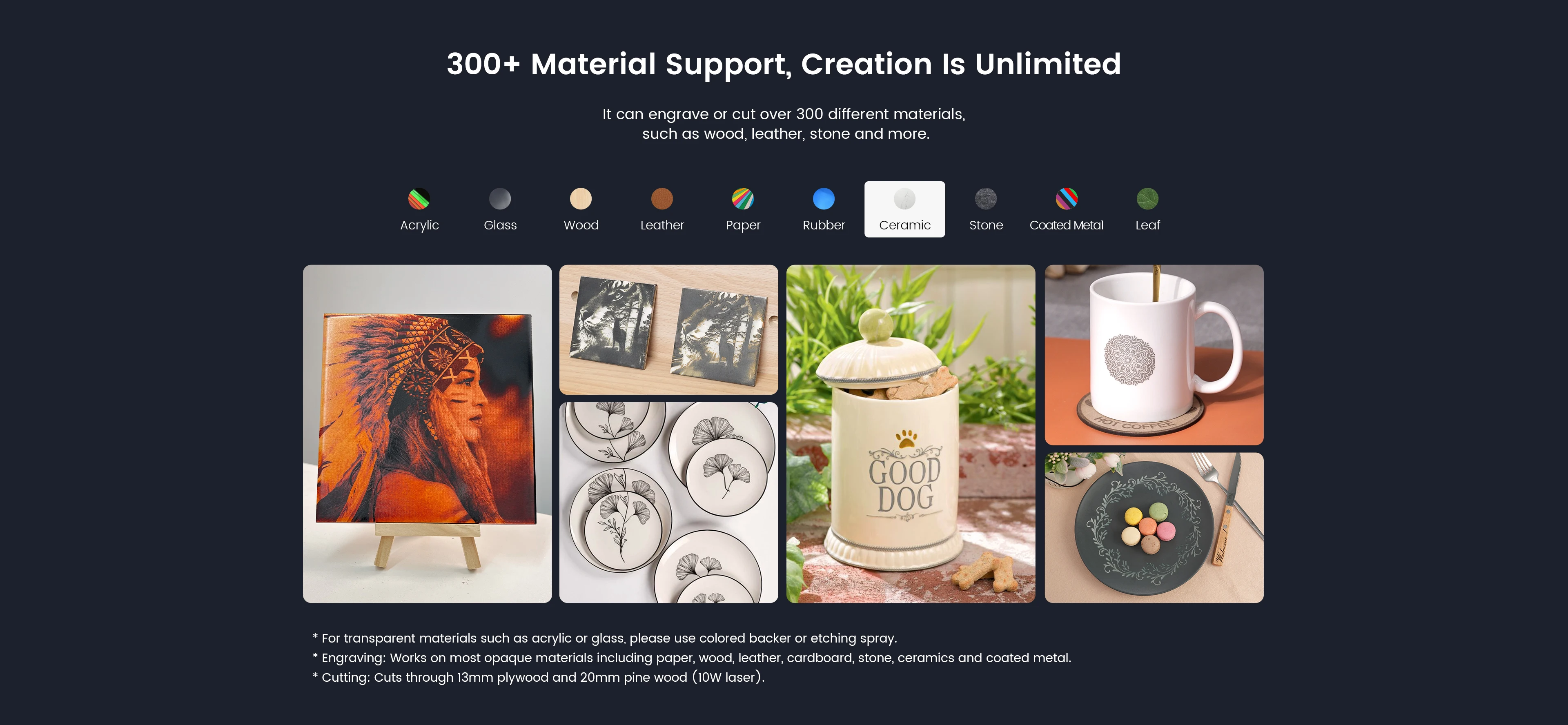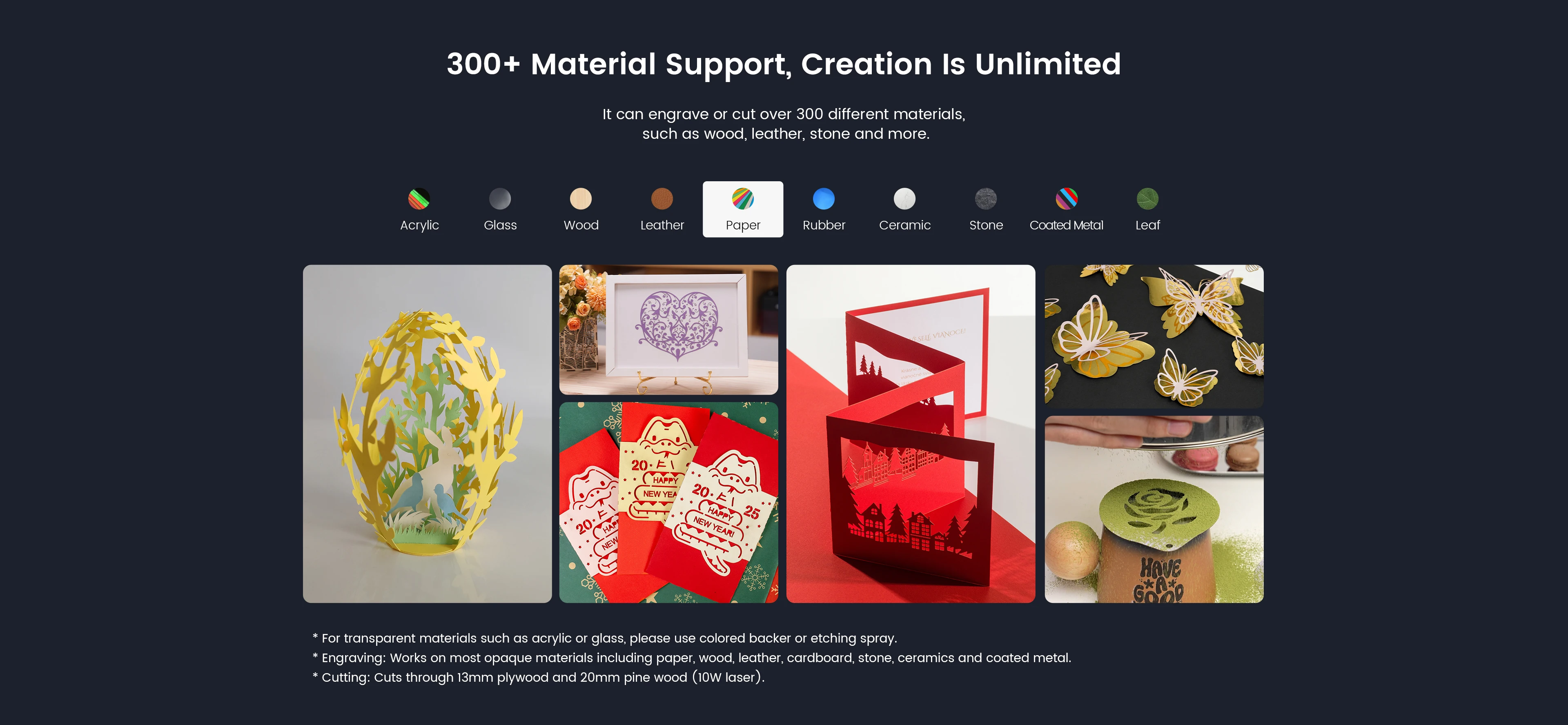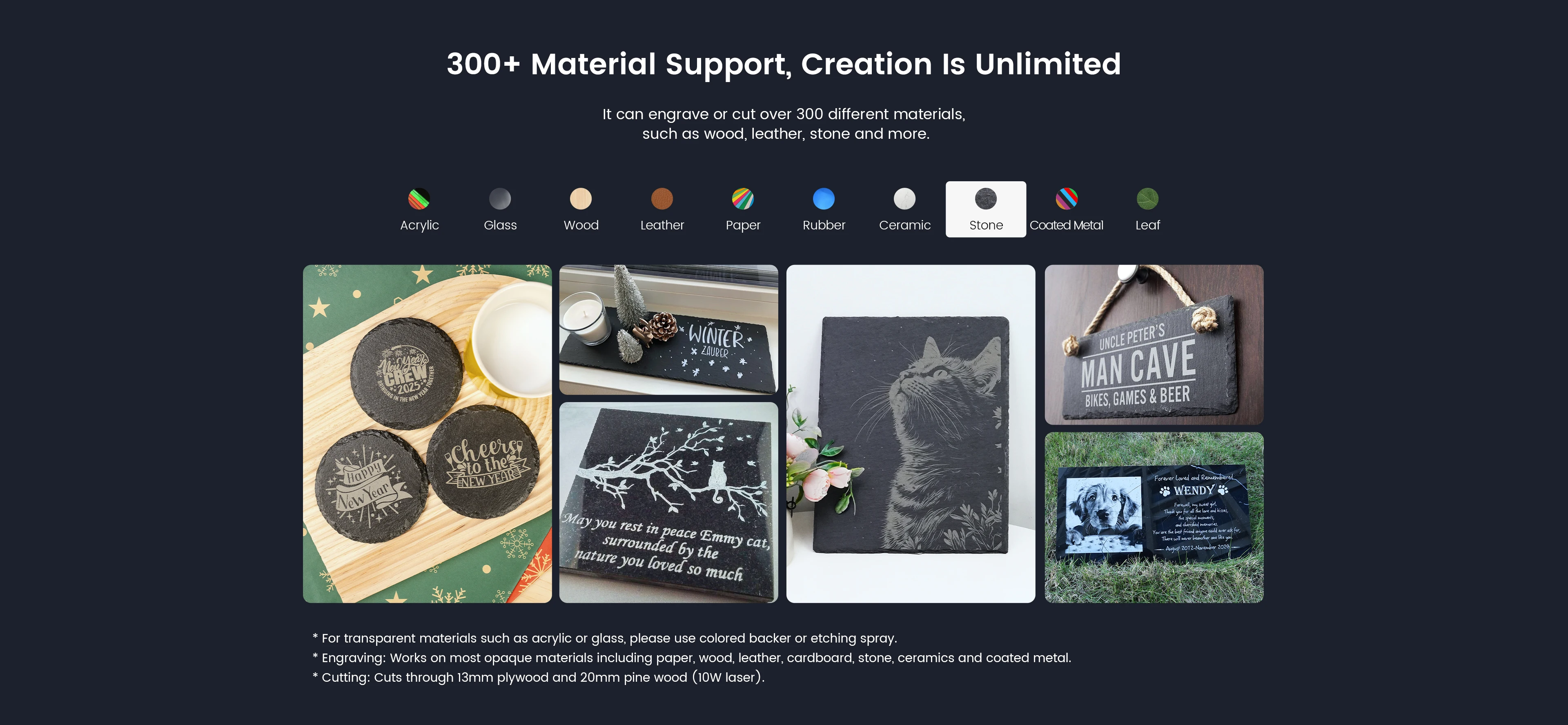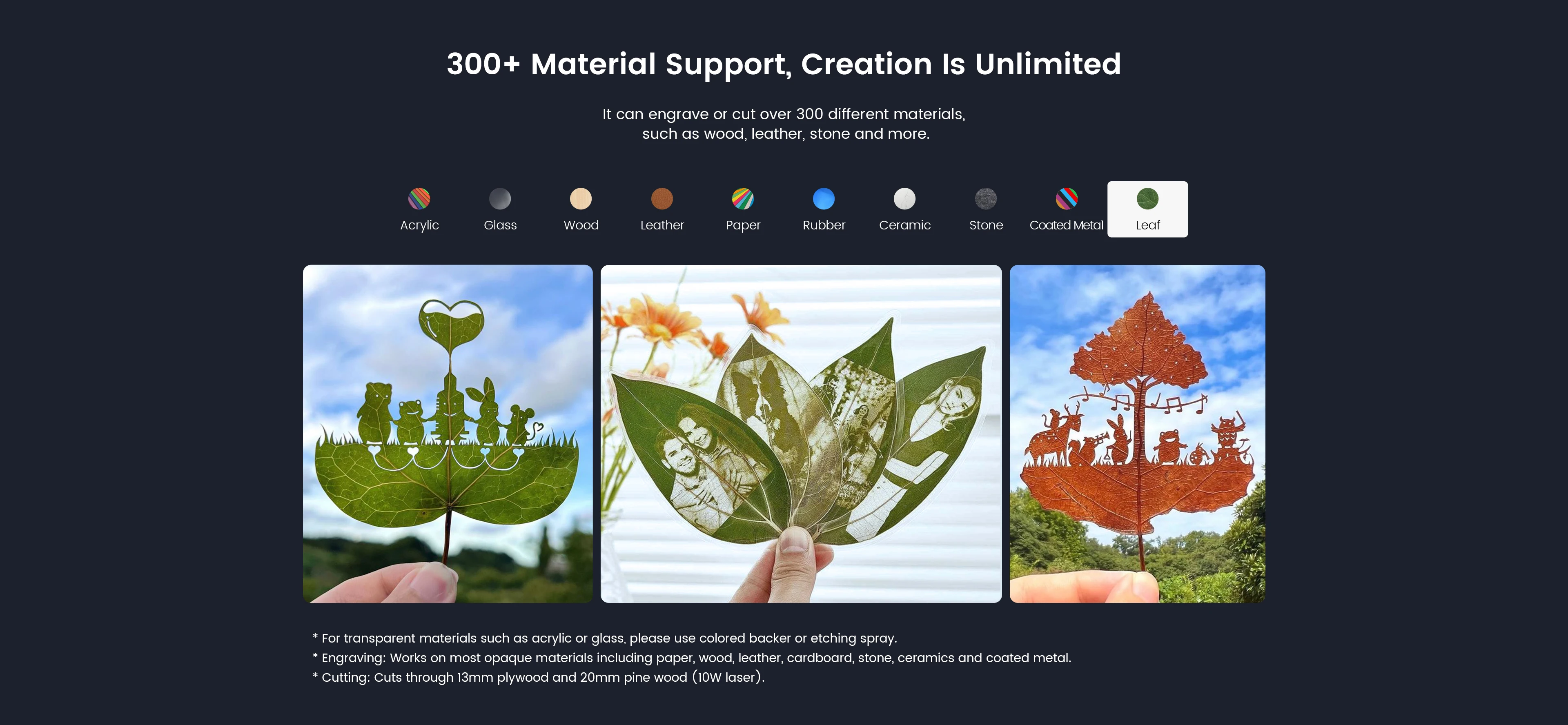 It can engrave or cut over 300 different materials, such as stainless steel, wood, leather and more. For transparent materials such as acrylic or glass, you might need to use colored backer or etching spray.
