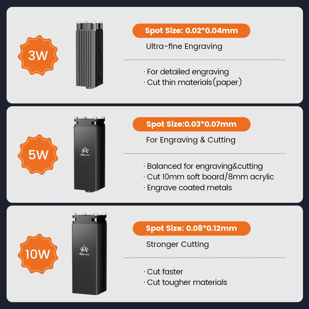 Choose from 3W for affordability, 5W for engraving, or 10W for cutting. (Note: Laser modules are not replaceable.)