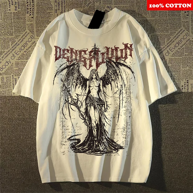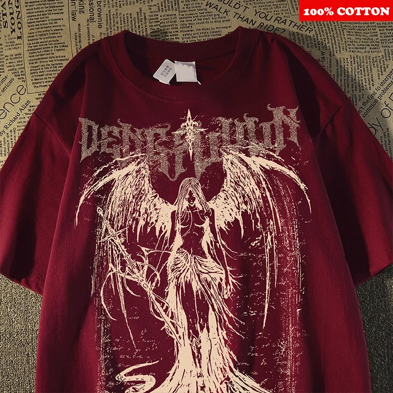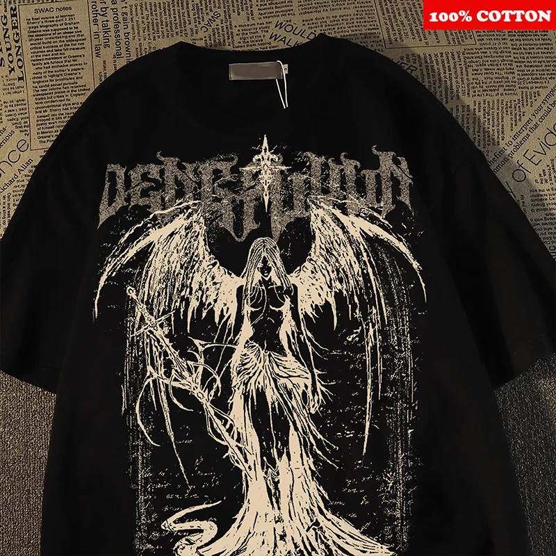 merican Retro angel Print T-shirt Men’s Summer 2025 New 100%Cotton Short sleeve Round neck T-shirt Y2k Top Street mens clothing