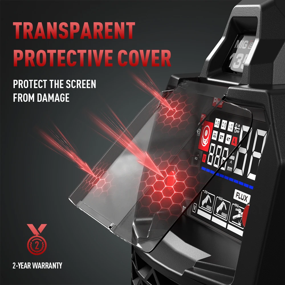 4.1-Inch Precision LED Display with Reinforced Protection: This 135A MIG welder features an oversized 4.1-inch LED screen for crystal-clear visibility, delivering real-time data with pinpoint accuracy—no need to remove your helmet mid-task. The MIG welder machine’s transparent protection cover safeguards the welder machine’s display against impacts, sparks, and debris, ensuring rugged durability and extended machine longevity for demanding workshop or job-site conditions.