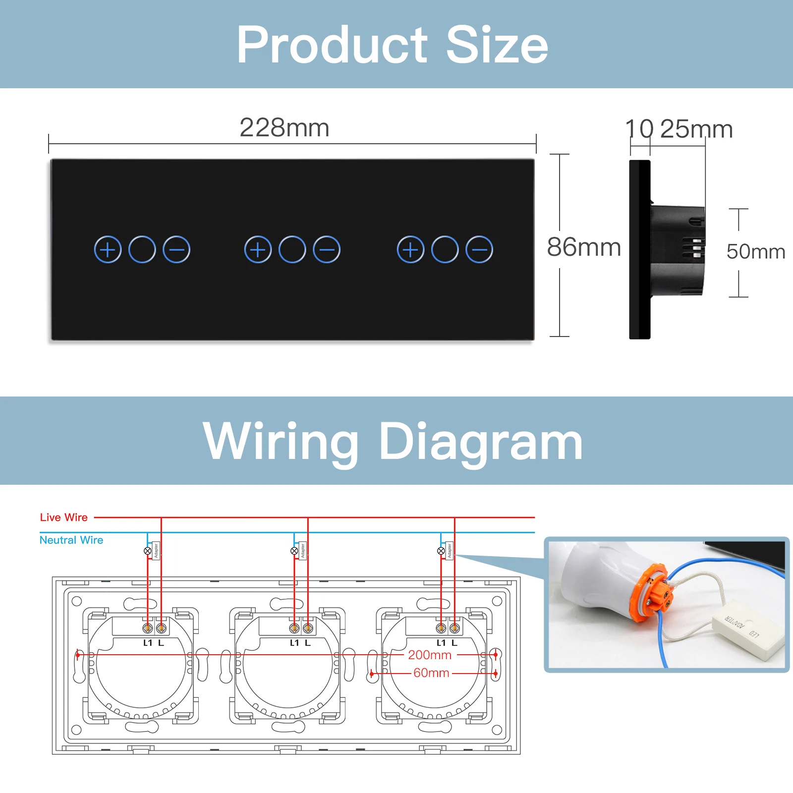 - Material: Glass Panel & Iron Plate & Plastic Switch Module