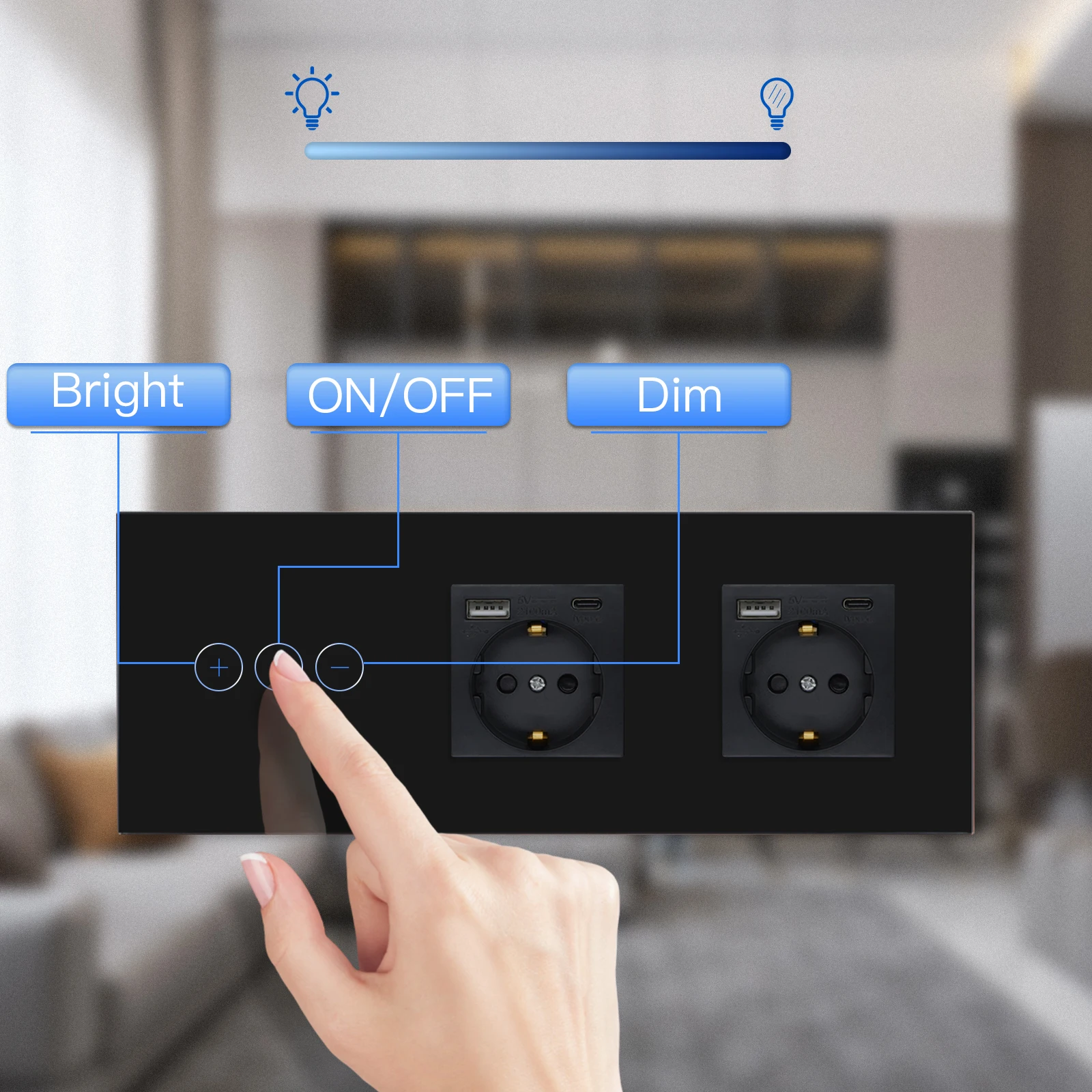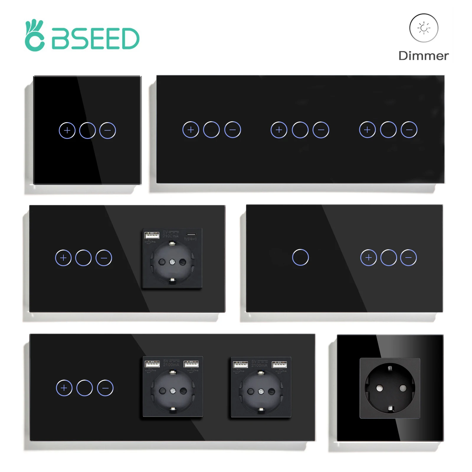 Bseed Dimmer Series EU Standard Dimmable Touch Switches Glass Panel 5V 2.1A USB Phone Charge EU Sockets LED Dimmer Wall Switches