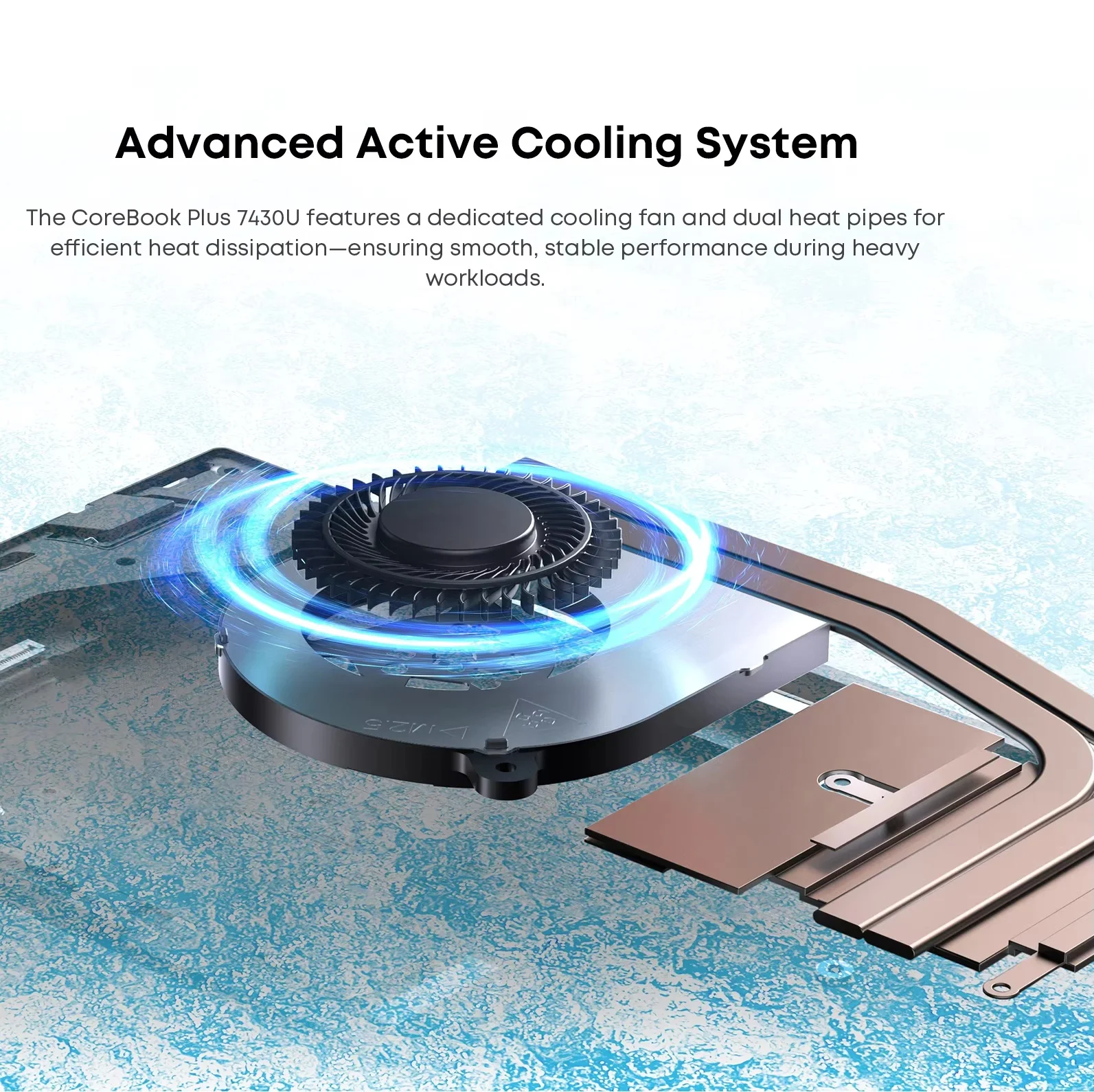 The CoreBook Plus 7430U features a dedicated cooling fan and dual heat pipes for efficient heat dissipation-ensuring smooth, stable performance during heavy workloads.