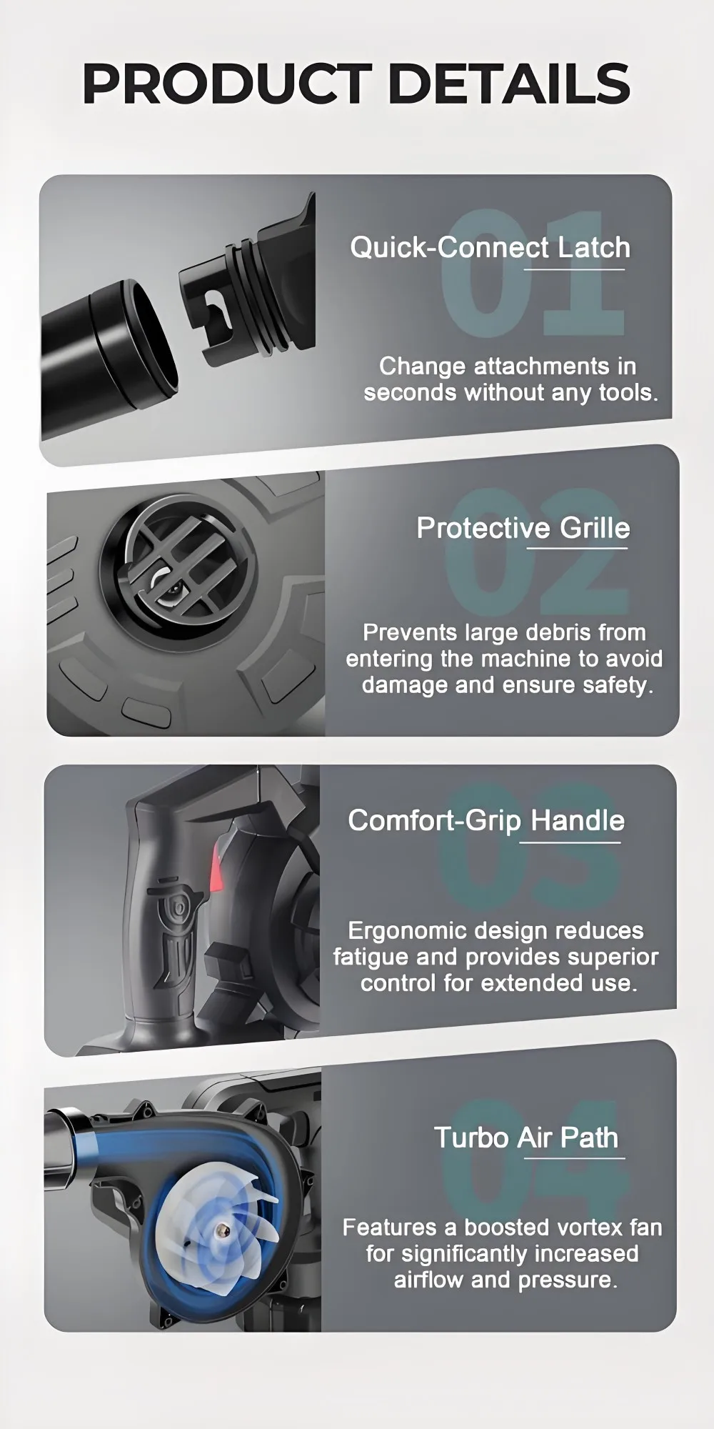 Functions as a powerful blower or vacuum cleaner. Quickly removes dust, leaves, pet hair, or small debris.