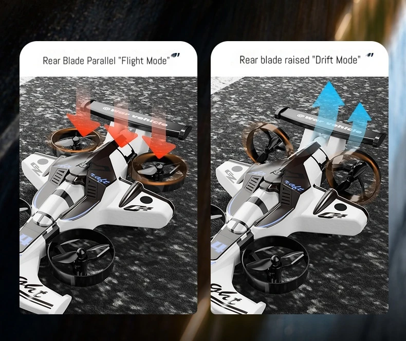 【Product Features】: Amphibious operation, drift mode, 360° flips, headless mode, one-touch take-off/landing, quad-fan propulsion system, powerful motor, three adjustable speed settings, one-touch hovering, barometric altitude hold, flight mode.