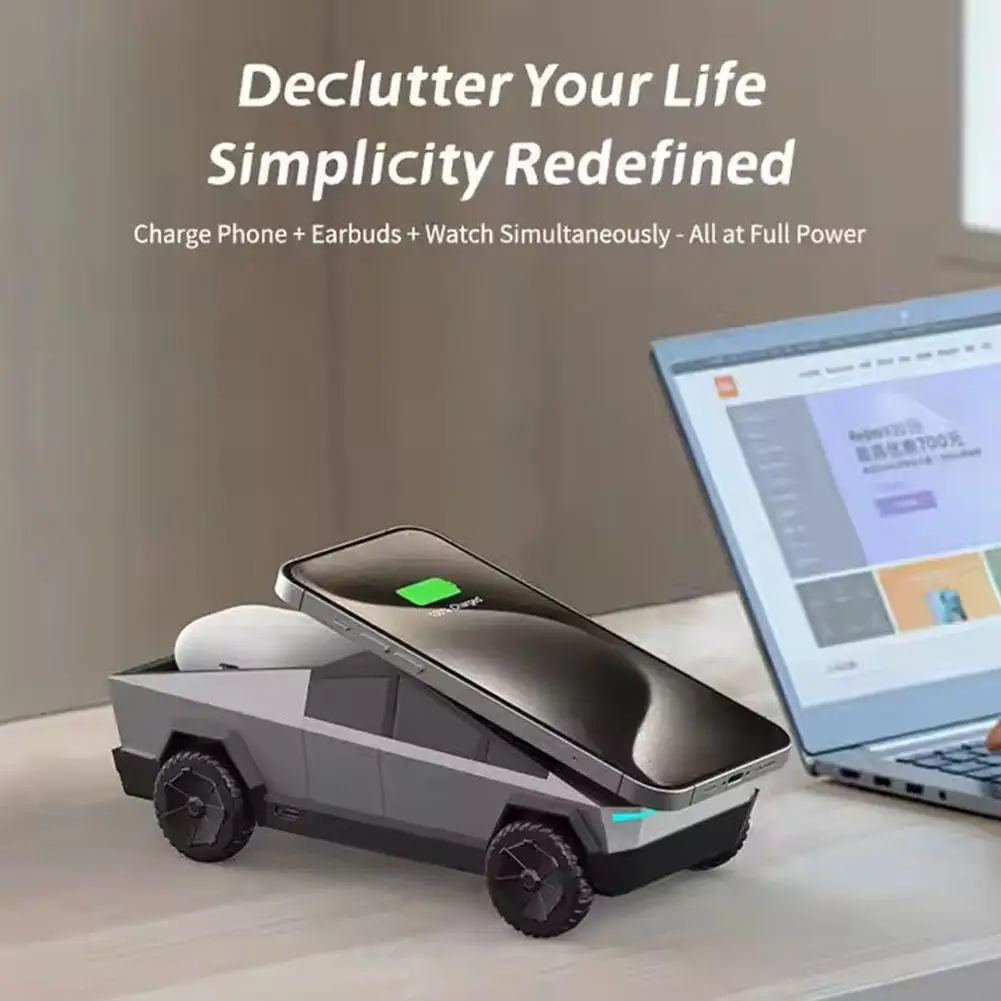 Six core designs: three devices charging at the same time, hidden charging compartment, automatic rotation, Cyberpickup, strong magnetic adsorption, technological atmosphere light