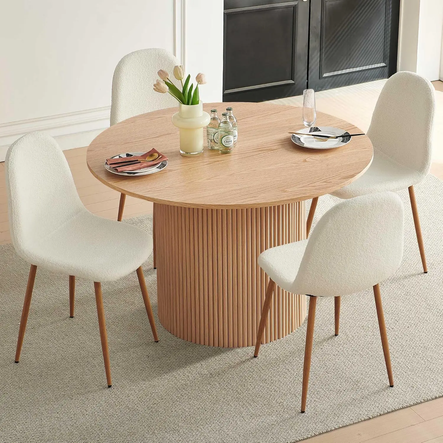 Round Dining Table Set for 4 – The round dining table set includes 1 dining table and 4 teddy fleece chairs. Round dining table maximize the dining area. Nature oak color finish to match any style of home decor.