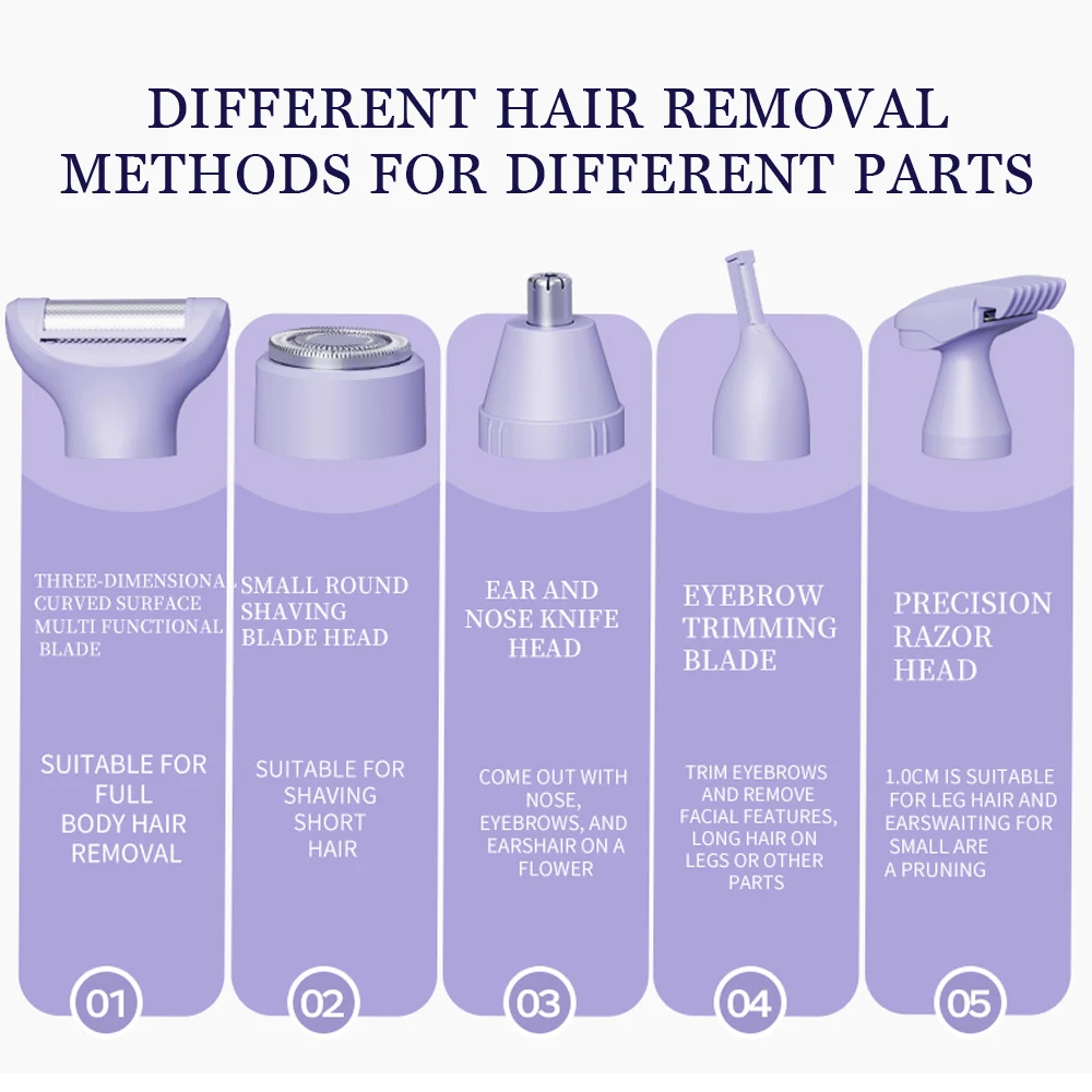 5-in-1 Multifunctional Women’s Shaver USB Rechargeable Cordless Hair Trimmer Electric Razor Portable Hair Remover for Body Nose Facial Eyebrow Leg Underarm