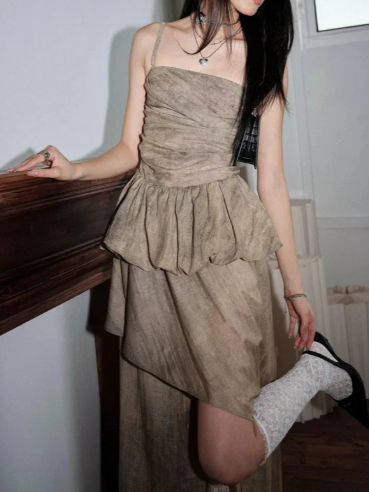 Elegant Two Piece Set Vintage Draped Back Asymmetric Camisole Top and Flowy High Waist Long Skirt Suit