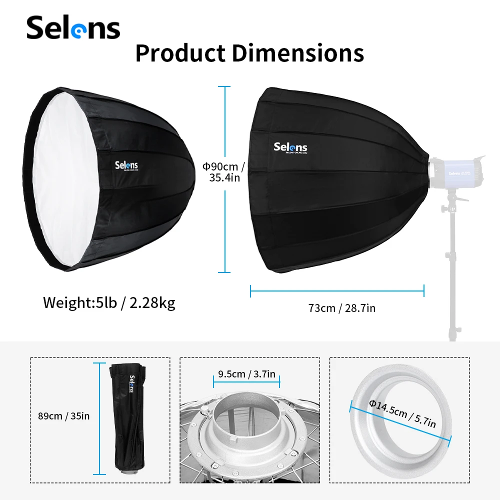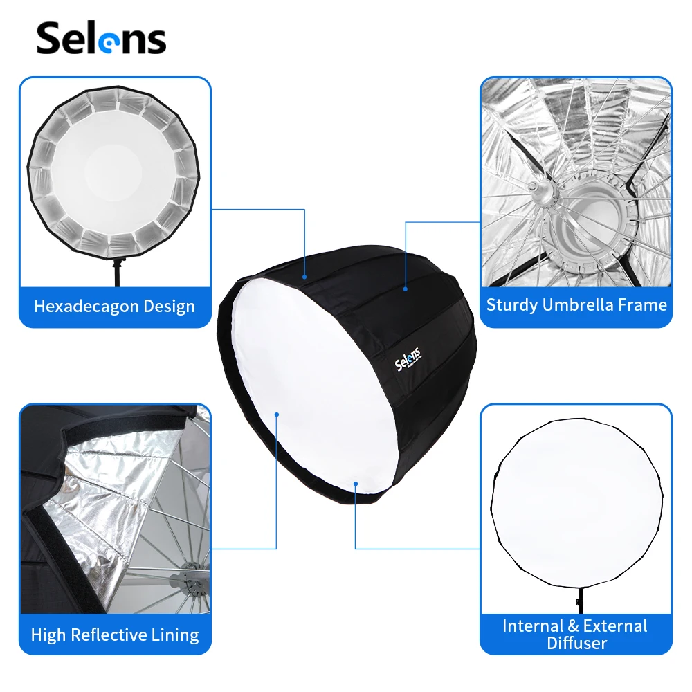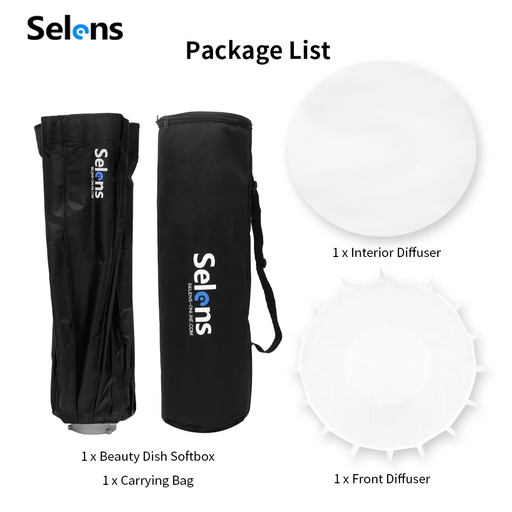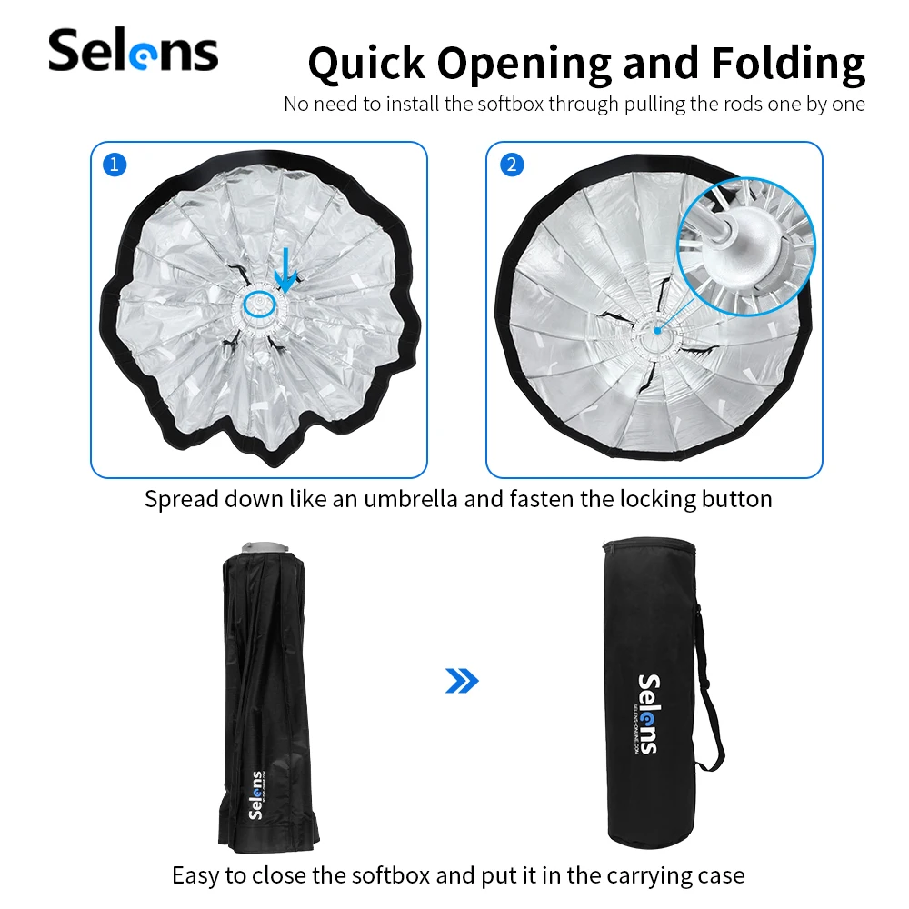 The 90cm parabolic deep softbox from Selens is commonly used in advertisements, movies, portrait photography, etc. A key features of the new Selens parabolic softbox is the quick release umbrella frame without any time-consuming task of the 16-rib assembling. The deep prabolic softbox comes with its own speed ring of Bowens Mount, and it provides the options of the internal and external removable diffusion panels, easily and quickly attached with velcro. The softboxes are also available in 70cm and 120cm as requested.