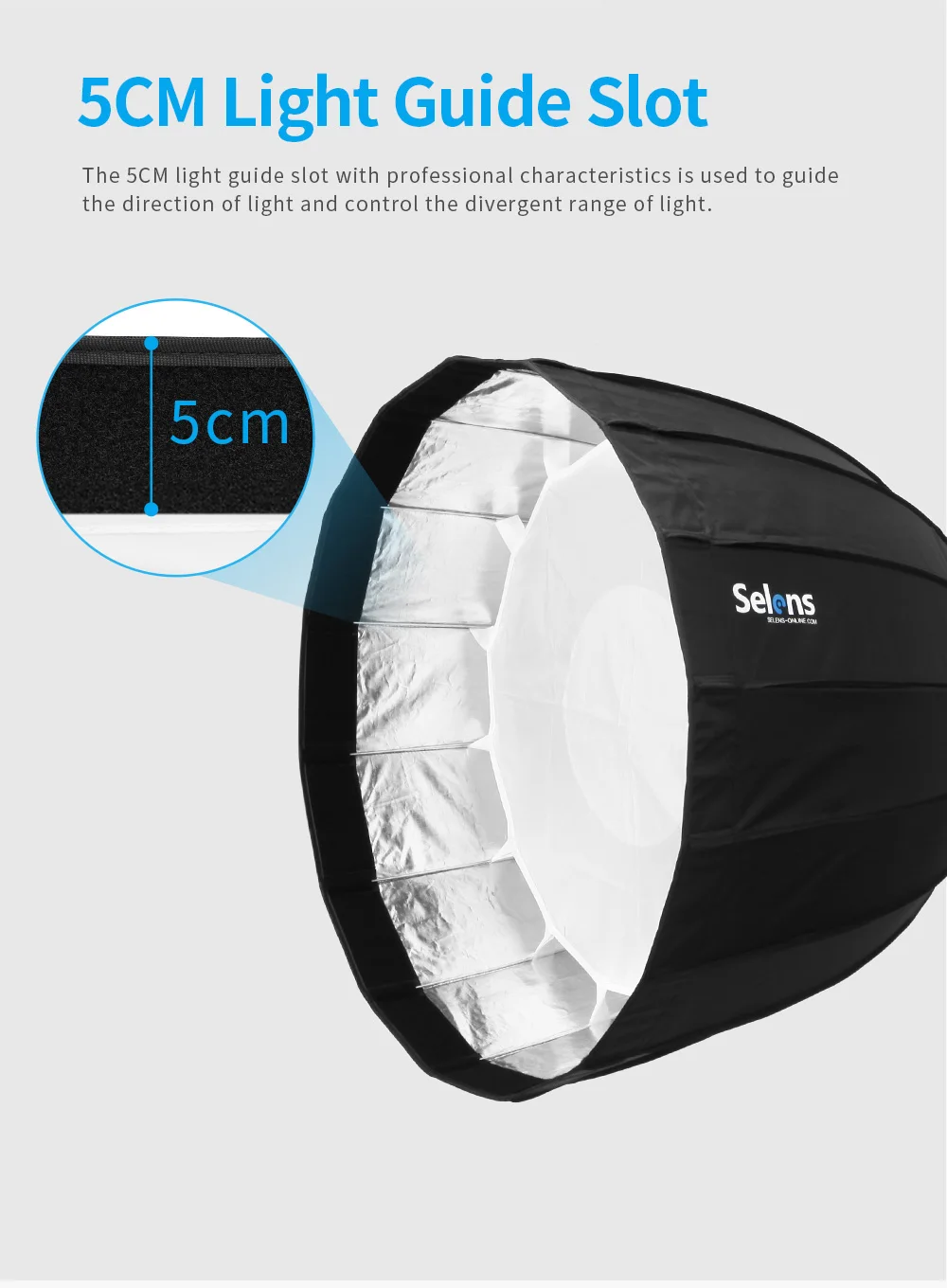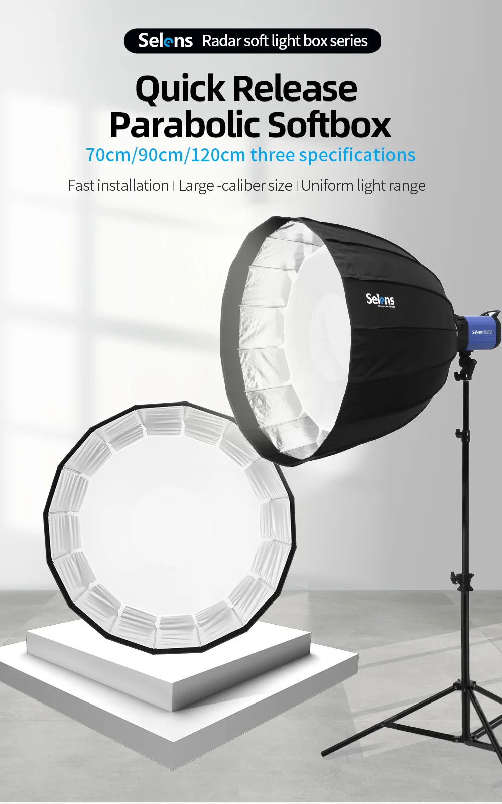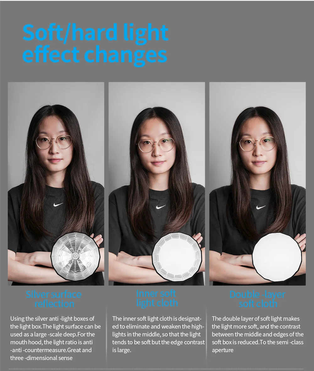 The 90cm parabolic deep softbox from Selens is commonly used in advertisements, movies, portrait photography, etc. A key features of the new Selens parabolic softbox is the quick release umbrella frame without any time-consuming task of the 16-rib assembling. The deep prabolic softbox comes with its own speed ring of Bowens Mount, and it provides the options of the internal and external removable diffusion panels, easily and quickly attached with velcro. The softboxes are also available in 70cm and 120cm as requested.