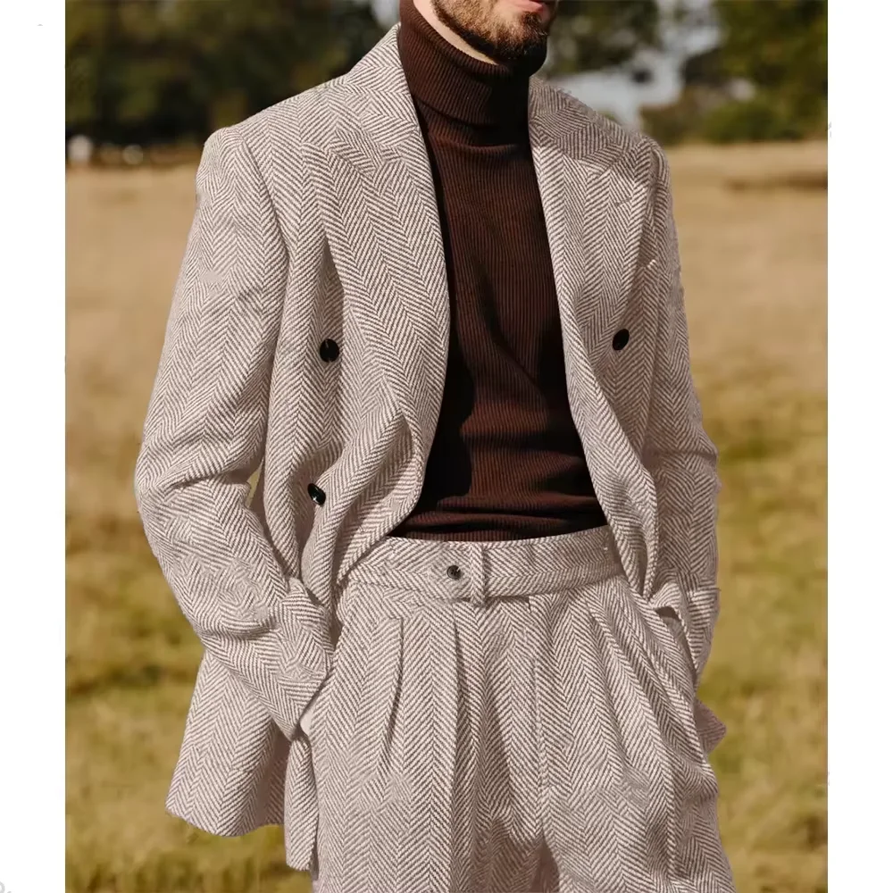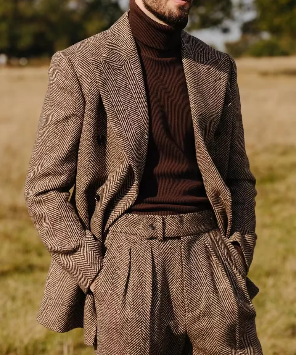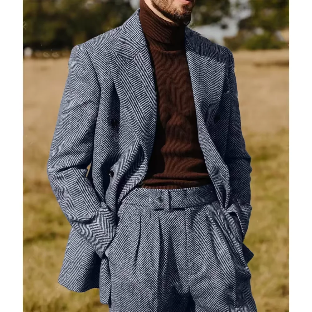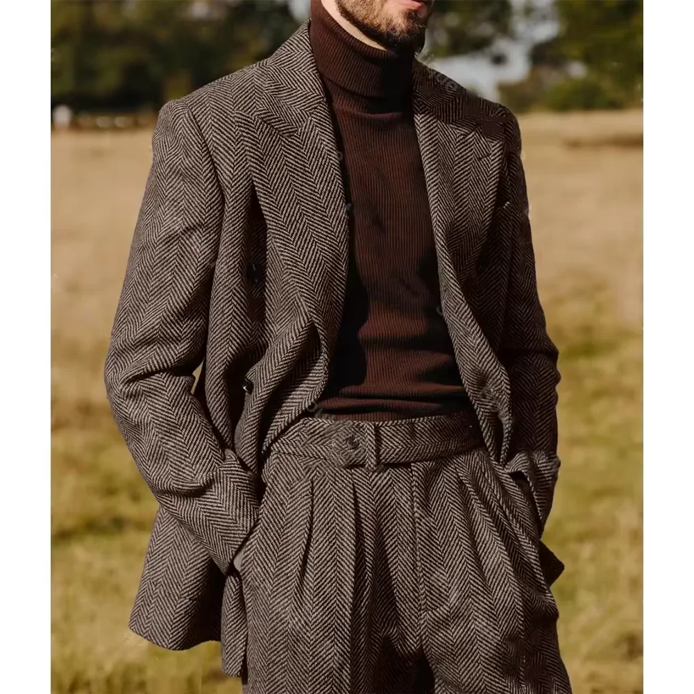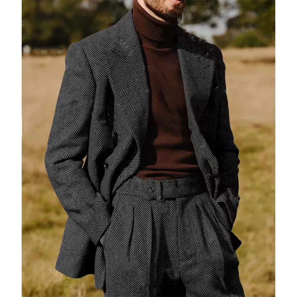 Crafted from premium herringbone polyester, this suit offers a classic look with a modern twist.