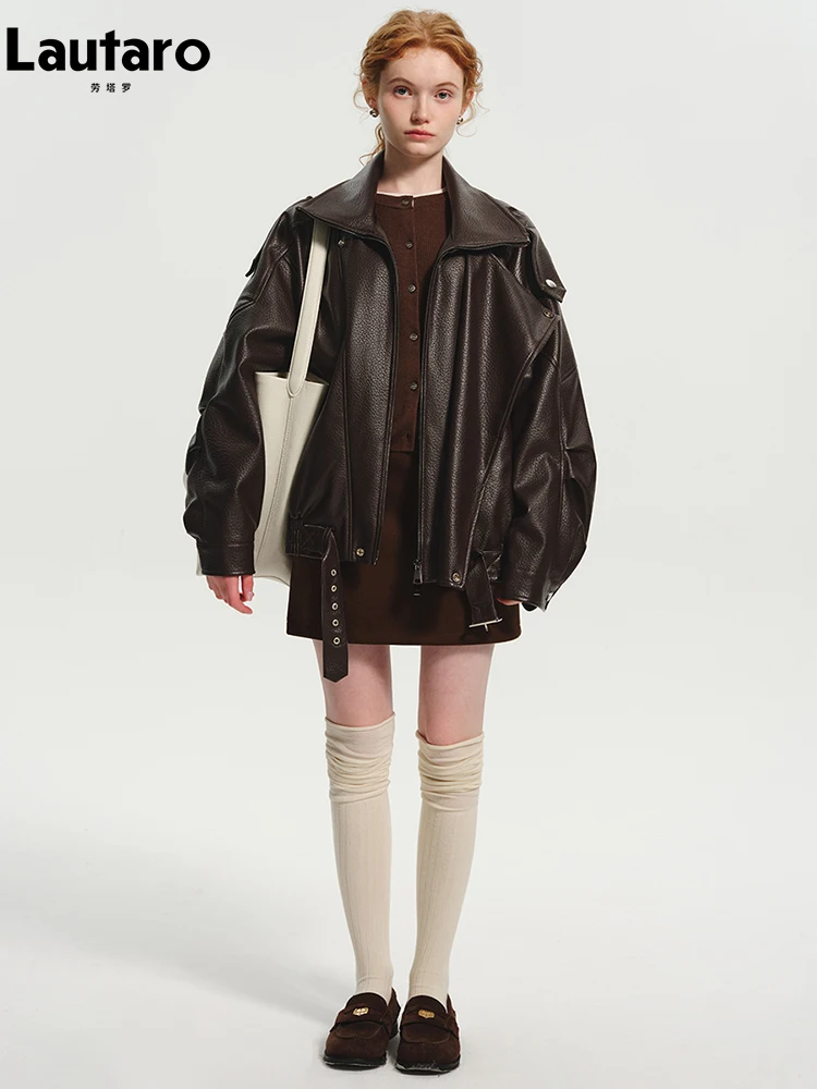 Lautaro Spring Autumn Cool Brown Oversized Pu Leather Jacket Women Long Sleeve Zip Up Luxury Designer American Retro Clothing