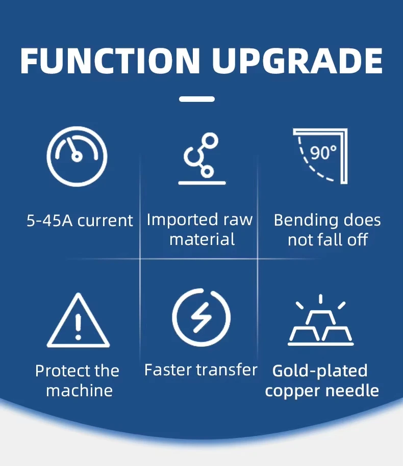1.5-45A current 2.Imported rawmaterial 3.Bending doesnot fall off 4.Protect themachine 5.Faster transfer 6.Gold-platedcopper needle