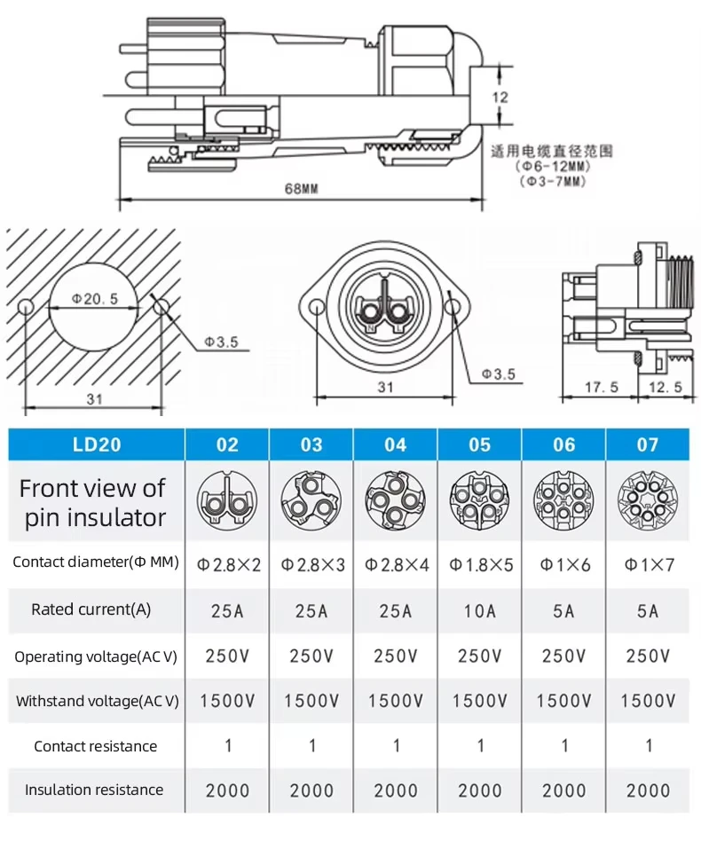 LD Series circular connector is a lightweight waterproof connector. It has IP68 – rated protection and uses screw clamping to connect cables, making wiring more convenient and quick. Non-welding screw crimpingGold-plated copper needlethermoplasticWear and anti-corrosion Firm and unbreakable