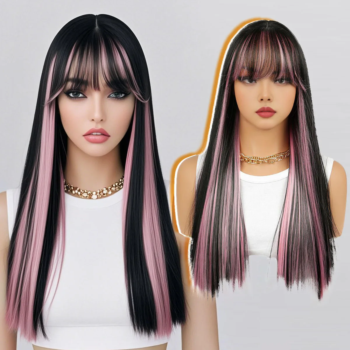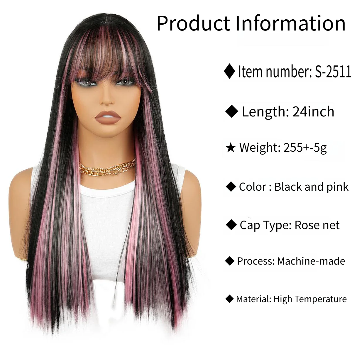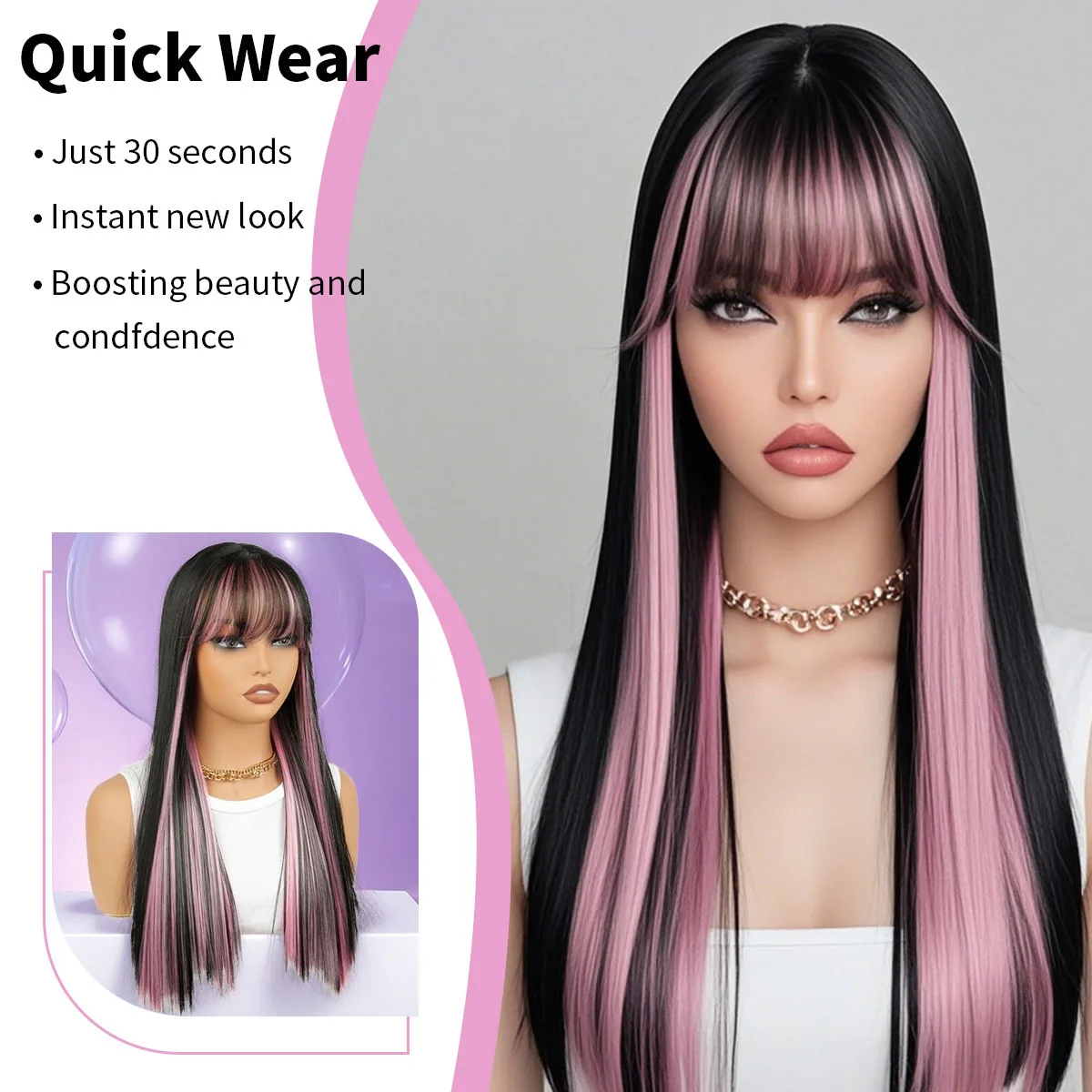 Straight Wigs With Bangs for Women Black and Pink Colored Hair Wig Synthetic 24 Inch Cosplay Party Holloween Daily Used