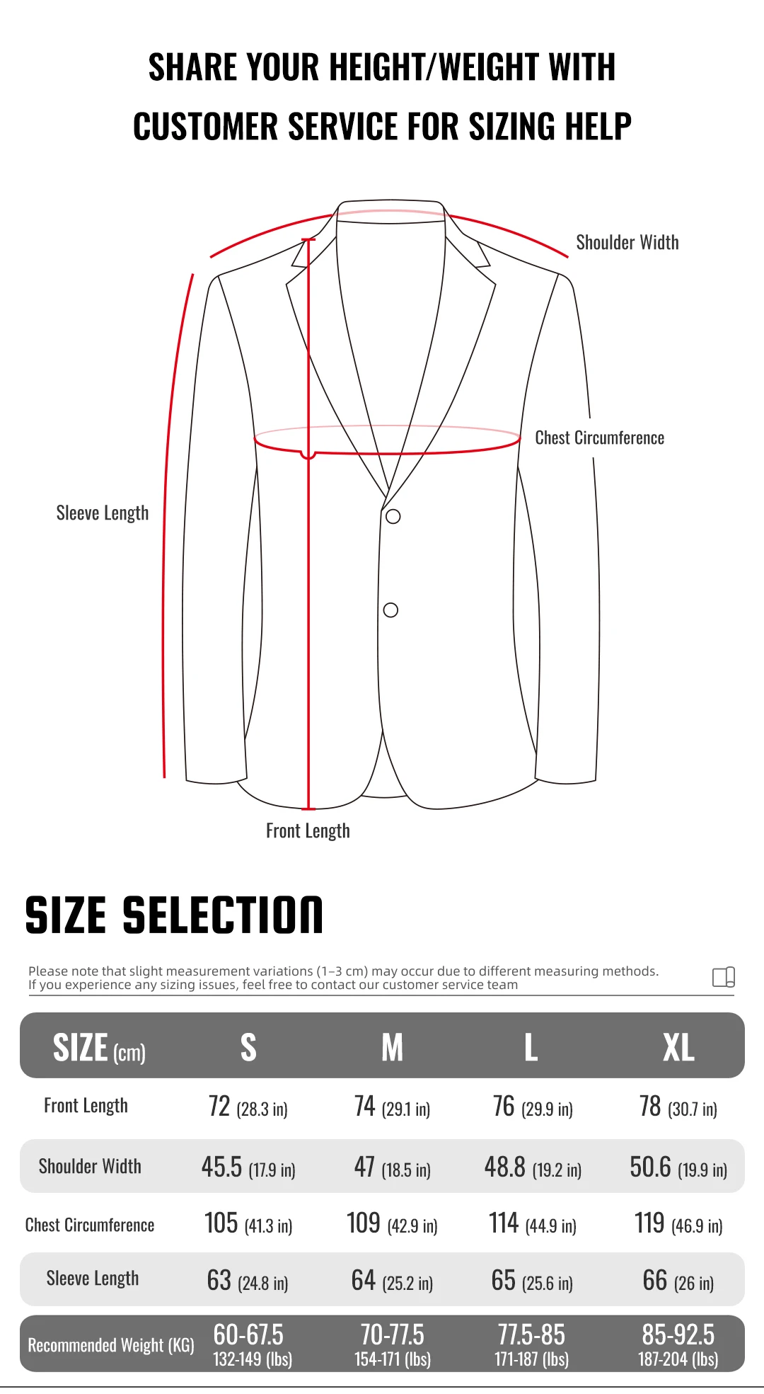 Suit Jacket: Measure from shoulder peak to wrist bone.