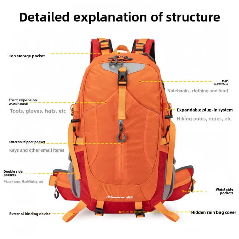 This hiking backpack features a multi-compartment structure with multiple pockets and zippers, designed to hold all your essential travel gear, such as water bottles, cameras, maps, and food, ensuring a worry-free journey.