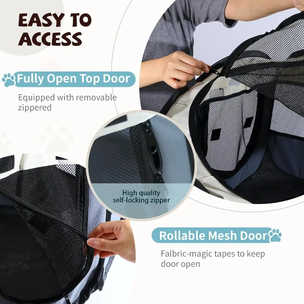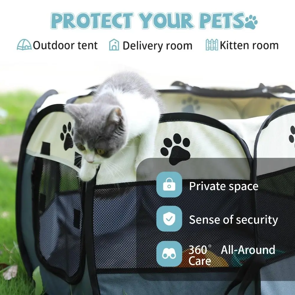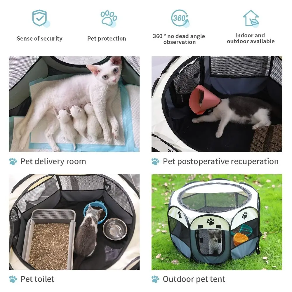 – Safe & Reliable: The cat playpen is made by oxford fabric, light and durable. Through the black mesh on the top and the other 8 sides, you can see each other easily, which will put both your mind at peace. The airy ample space can also prevent you pets from feeling stifling or oppressed. A perfect place for your pets to deliver, recover or rest.