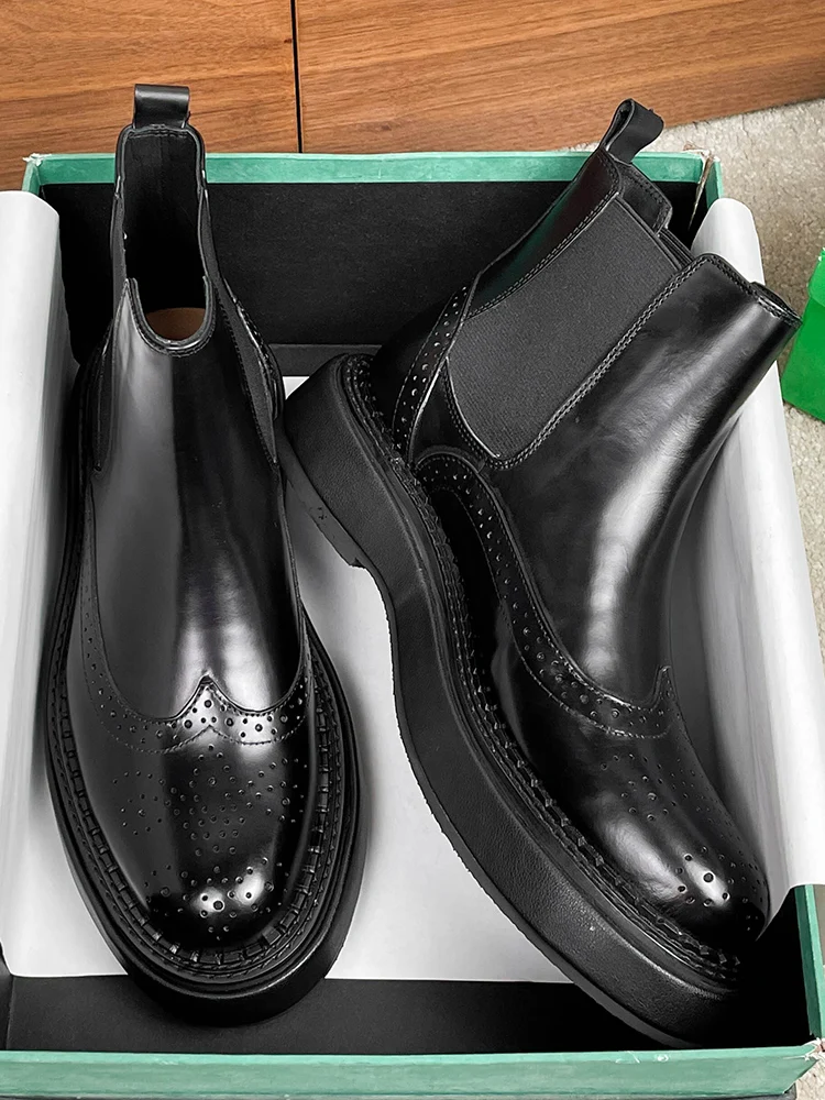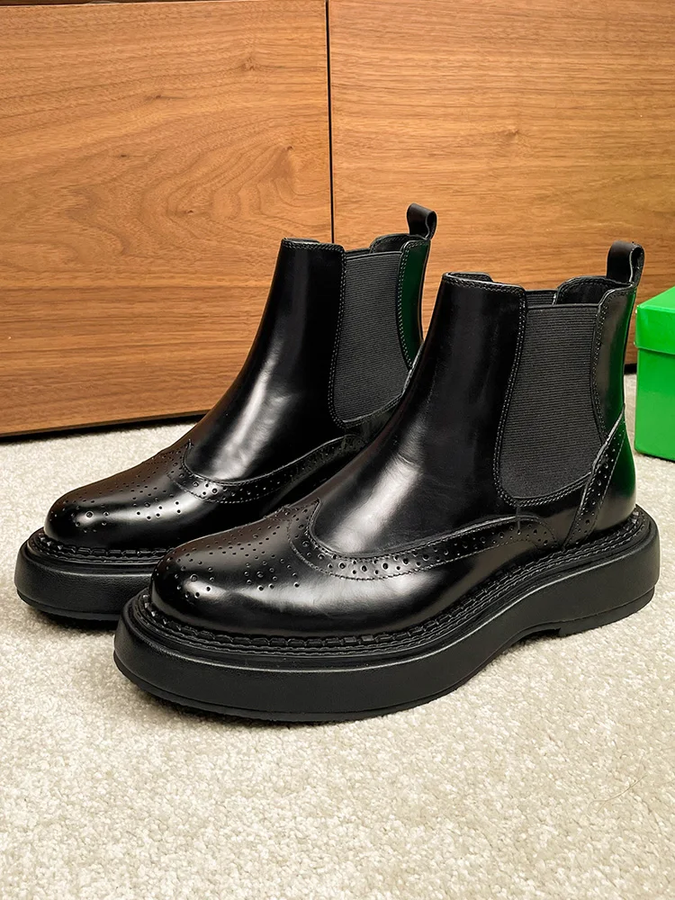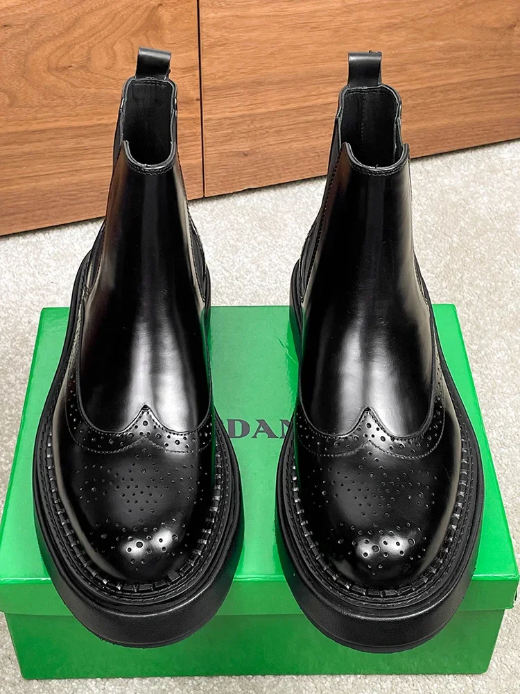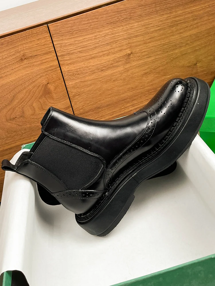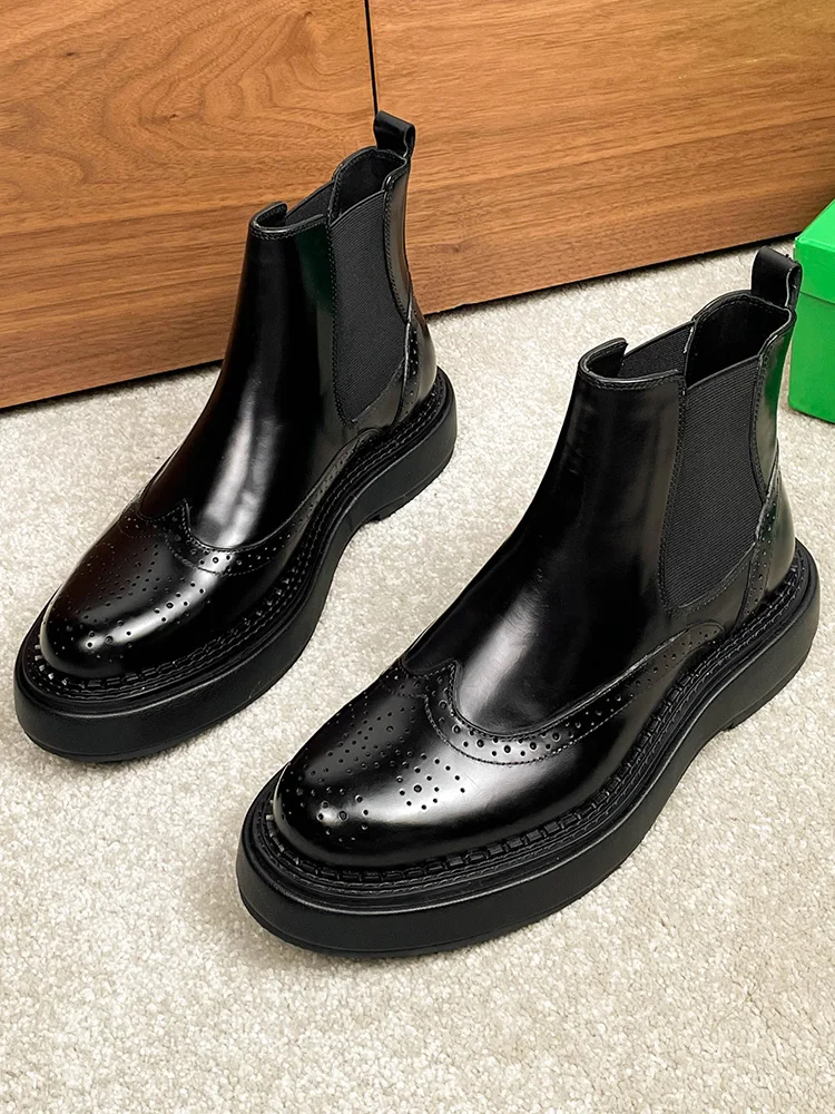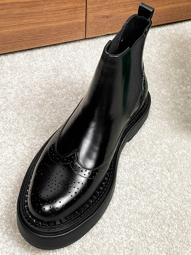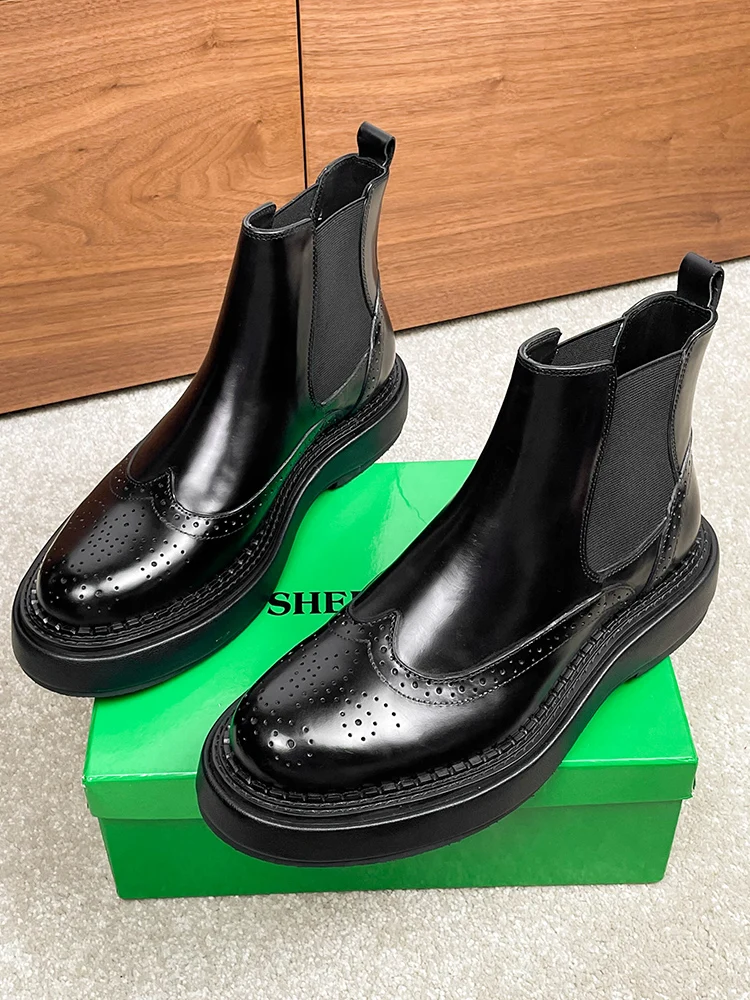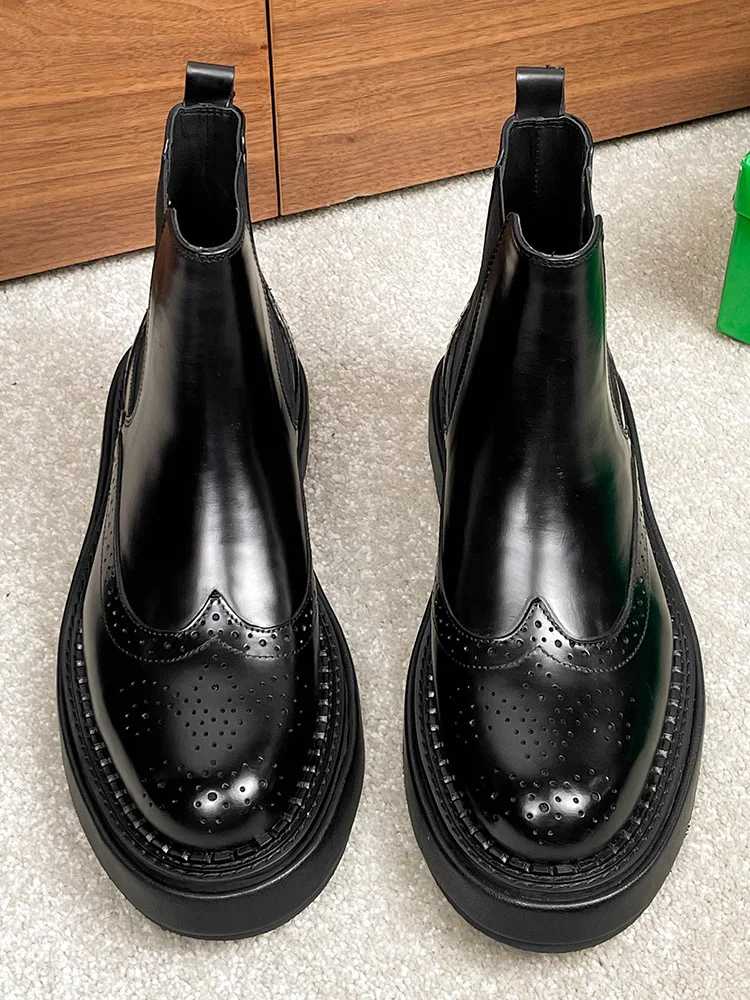 Spring and Autumn New Men’s Formal Leather Shoes Round Head Thick Sole Brock Carved Flower Chelsea Boots