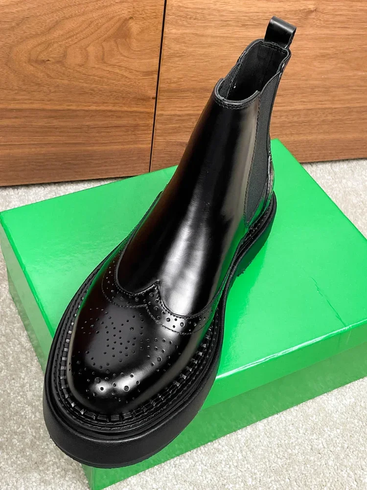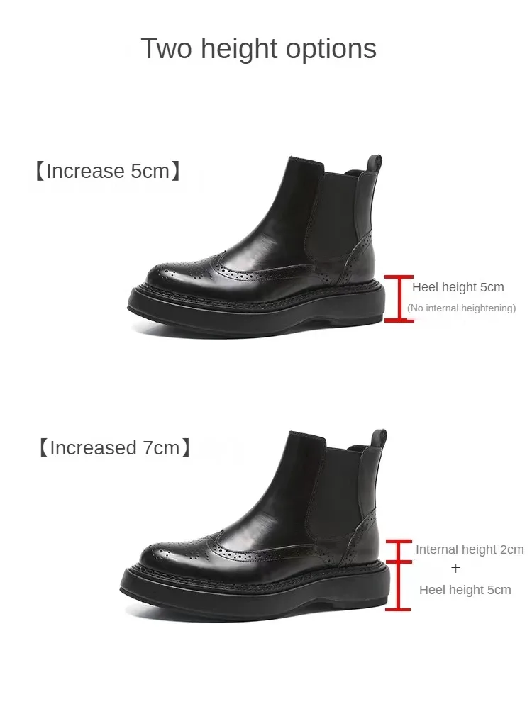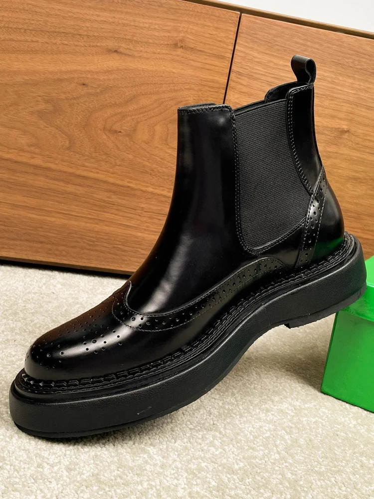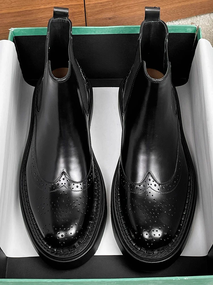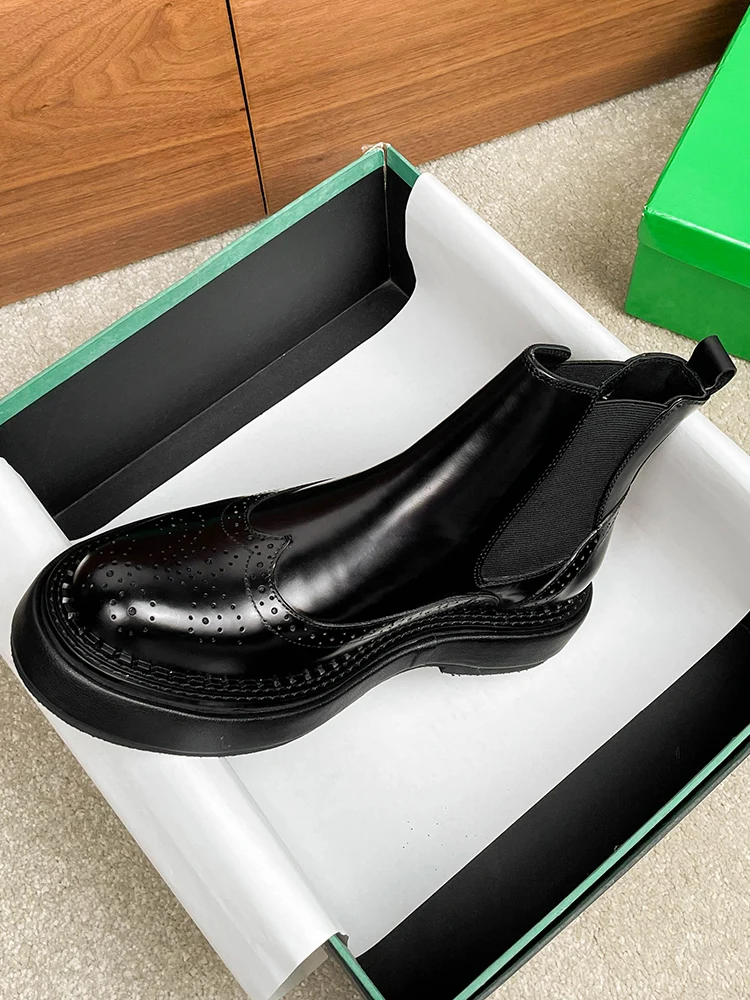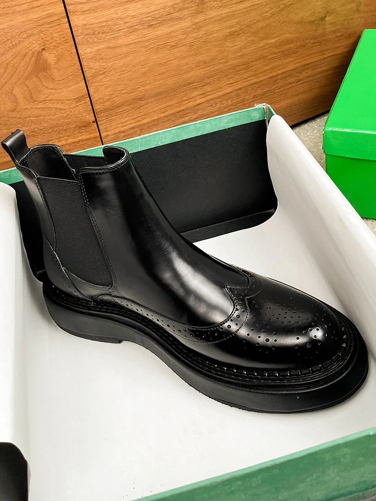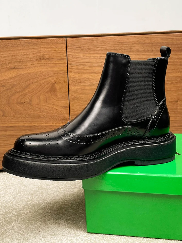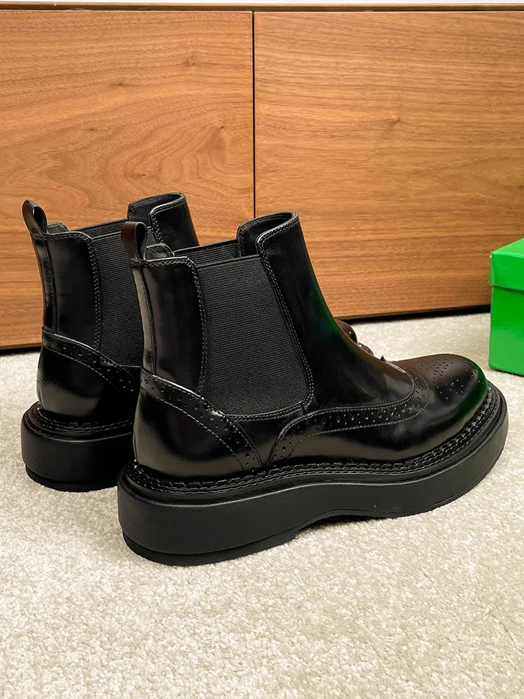 Spring and Autumn New Men’s Formal Leather Shoes Round Head Thick Sole Brock Carved Flower Chelsea Boots