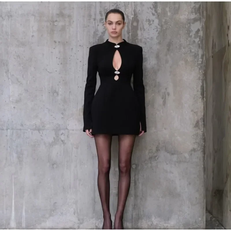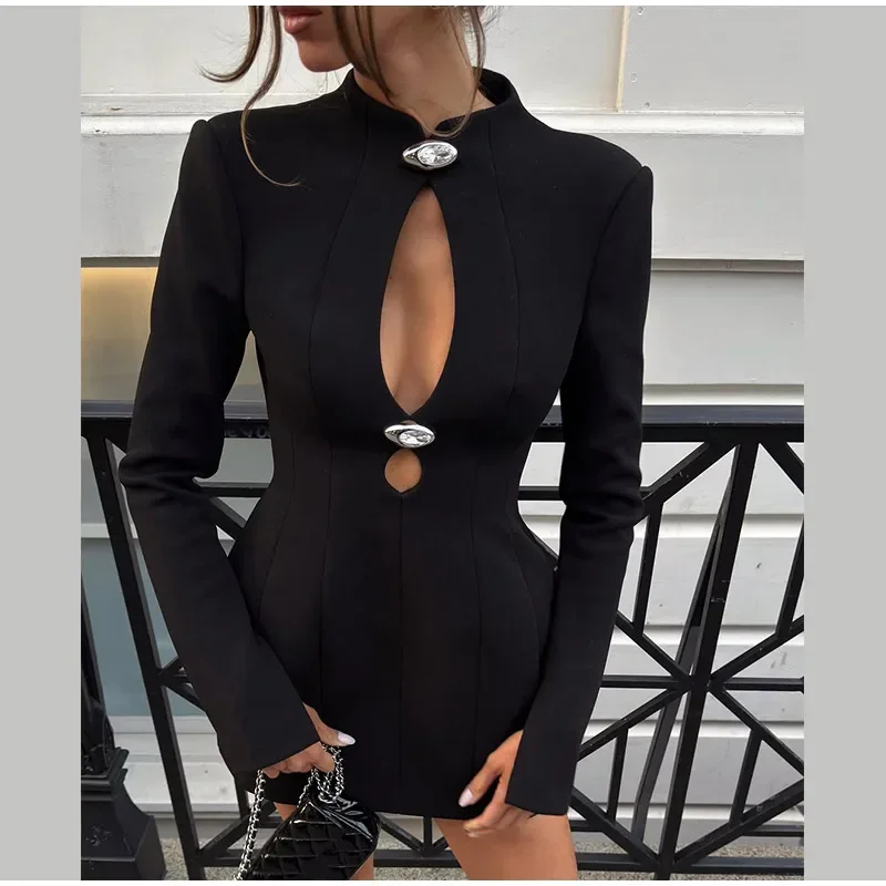 Hollow Out Long Sleeve Sexy Mini Dress Women Gown Elegant Winter New Half High Collar Metal Buckle Club Party Dresses
