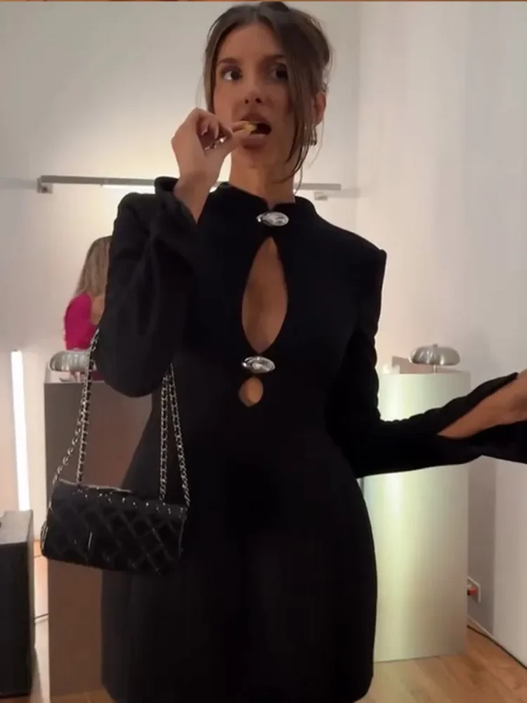 Women Hollow Out Short Dresses Black Round Neck Full Sleeve Waisted Bodycon A-line Vestidos 2025 Lady Daily High Street Gowns