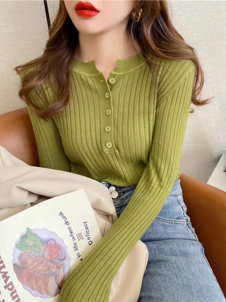Women Solid Versatile O-neck Knitted Pullover 2025 Autumn Winter Sweater Female Long Sleeve Slim Elastic Button Stripes Jumper