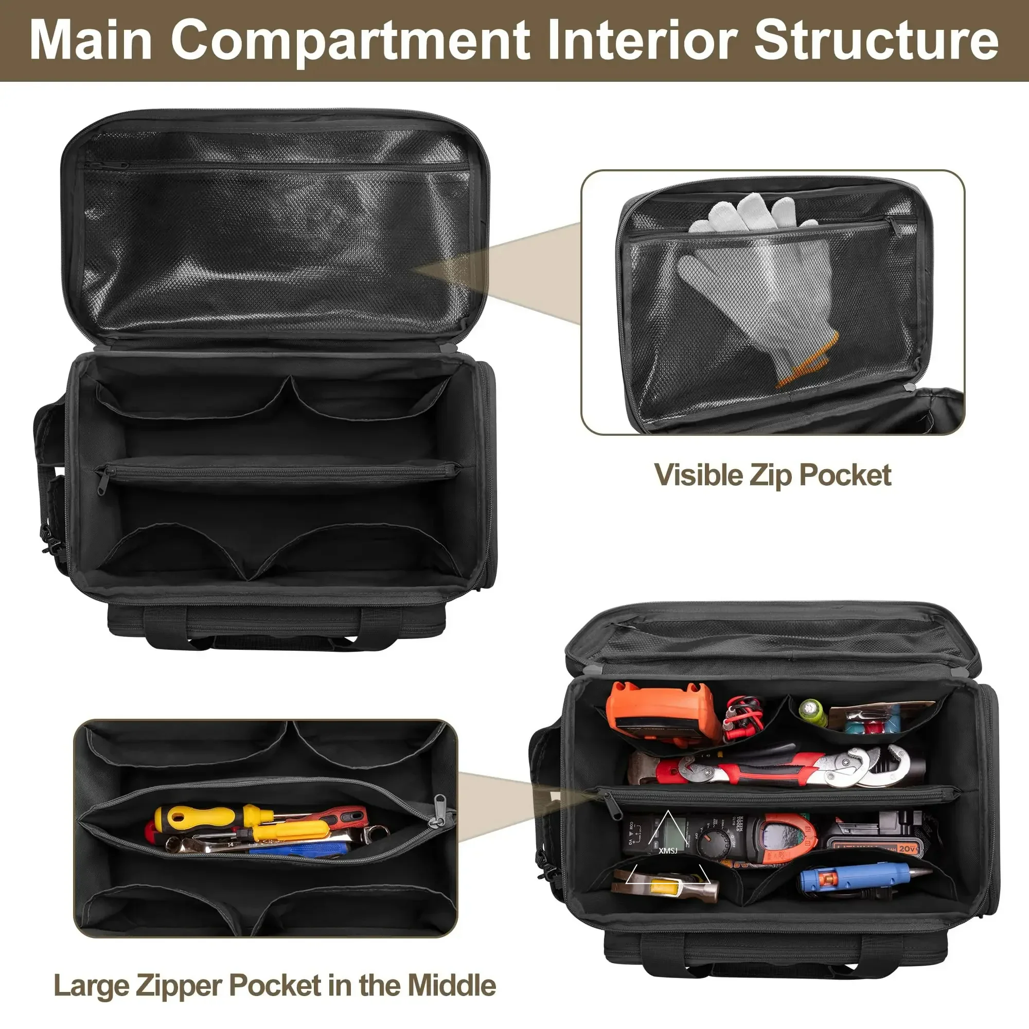 DIMENSIONS – 14.4 × 8.5 × 8.1 in (approx. 36.5 × 21.5 × 20.5 cm). Widely used in industrial, DIY, and outdoor maintenance to organize messy tools with visible categorization. Ideal for technicians, electricians, carpenters, and handymen.