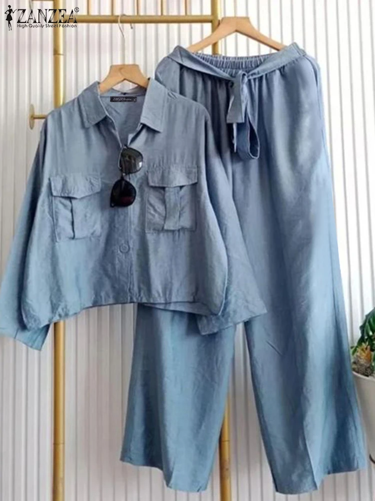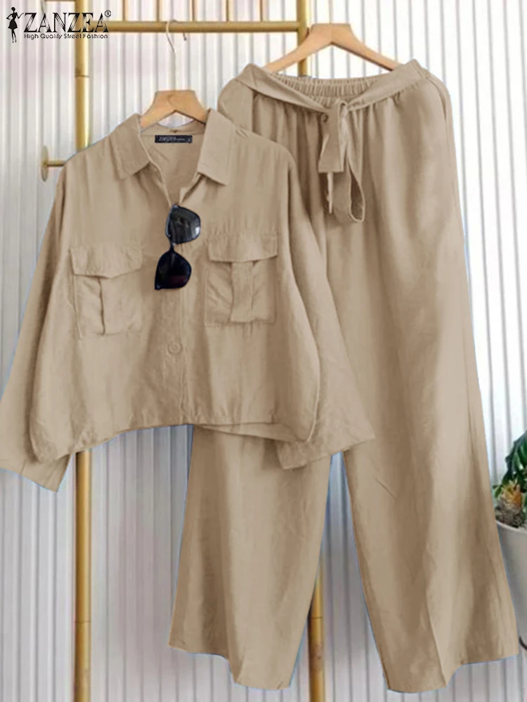 ZANZEA Plus Size Womens Fashion 2-Pieces Sets Long Sleeve Short Shirts Belted Wide Leg Pants 2pcs Outfits Casual Loose Pant Sets